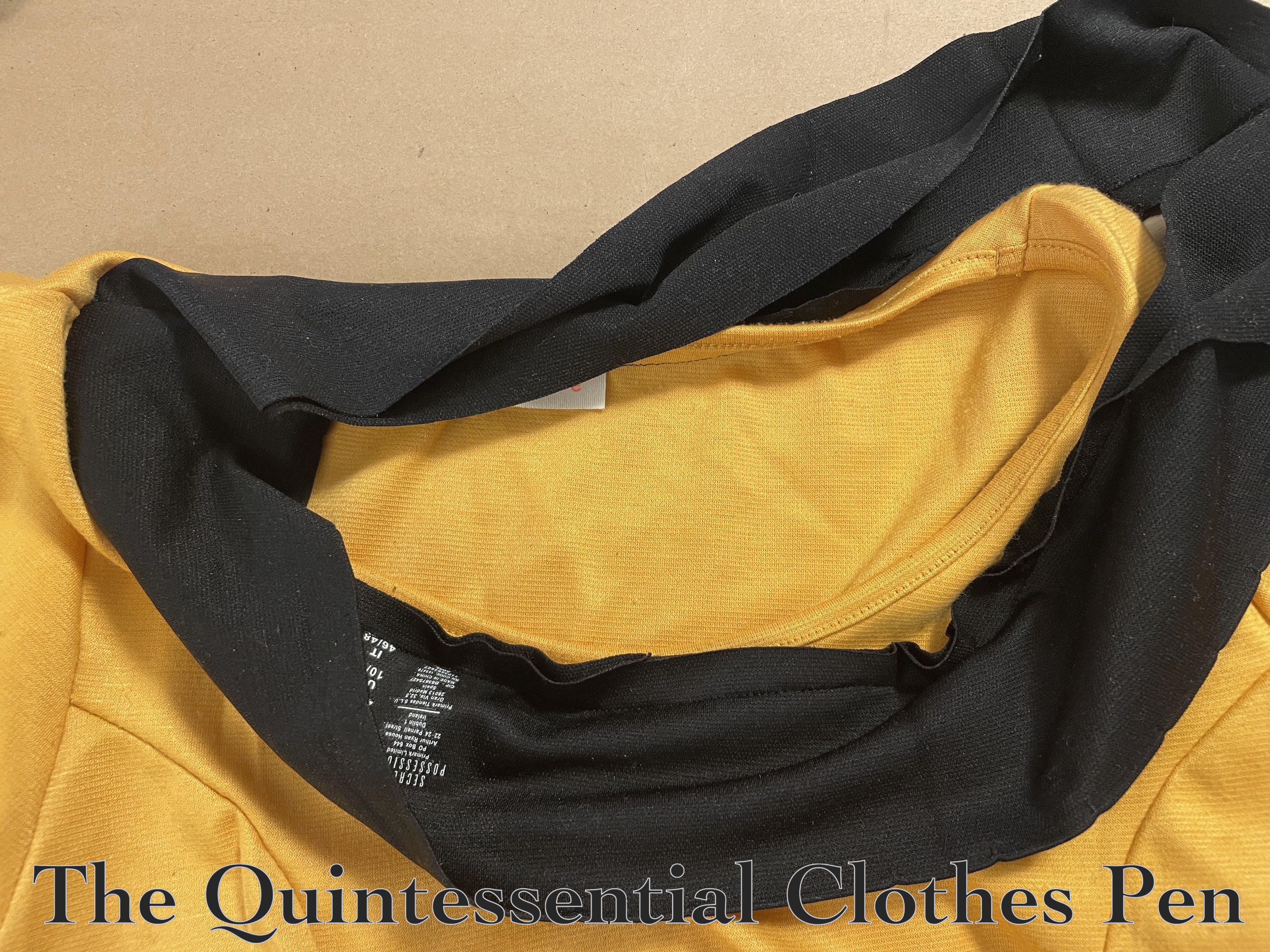I decided how wide I wanted the band to be and cut a piece twice as wide as I needed, so it could fold in half. I stitched it to the dress, leaving the ends free so I could get the perfect length and the right tension on these two knit fabrics. Below, a photo showwing the neckline of the marigold dress and the left angle change (on the right in the photo), as well as the black band cut from the recycled shorts stitched onto the outside of the dress. I was entertained that the tag area of the shorts made it into the neckline of the dress!