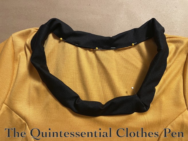 I had a real life dress is a lovely shade of marigold yellow that had been retired from regular circulation in my wardrobe, but which I kept on hand because I kept thinking “this is the perfect color to become that Star Trek dress!” When it was worn for real life, though, I couldn’t figure out how to easily make it uniform like as much as I wanted without some permanent changes, but after it had been sitting in a box for a year or more I was ready to make those permanent changes to have a Star Trek dress!