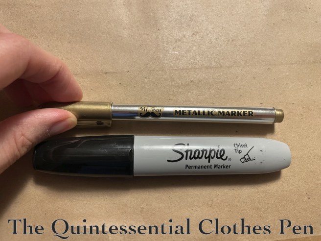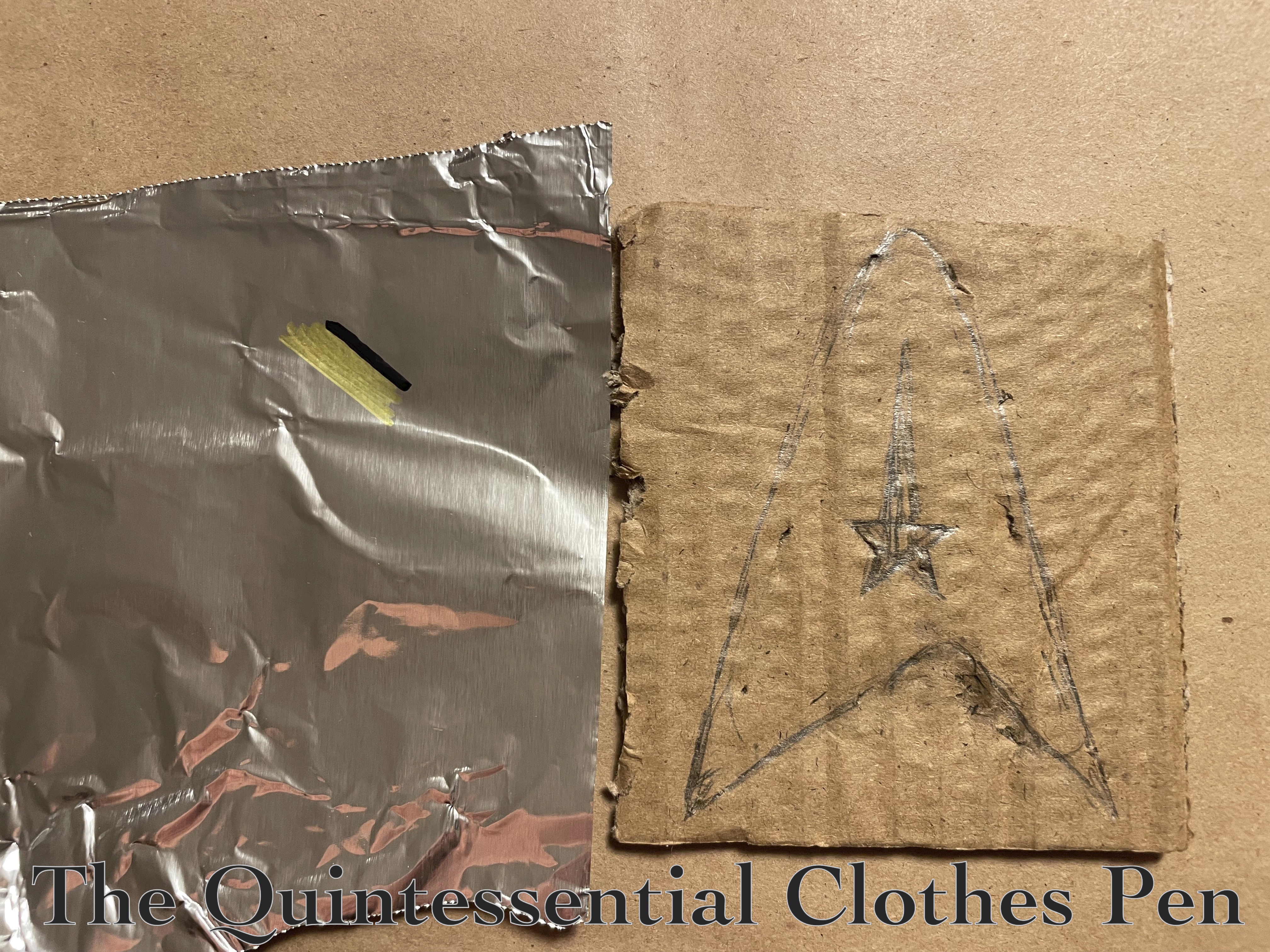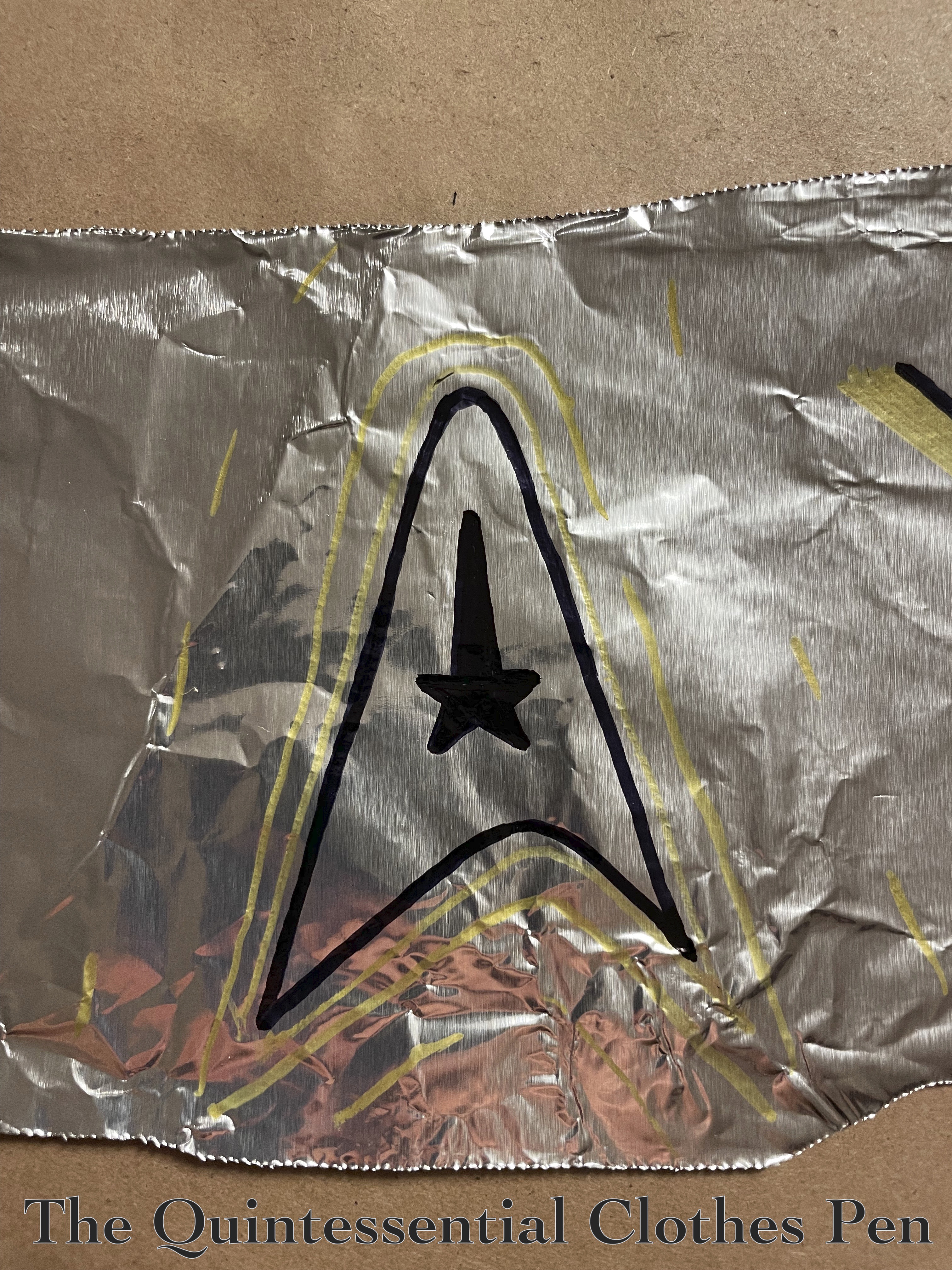 I started with tinfoil, a sharpie, and a metallic gold pen. Photos of my supplies and test foil (to see if the sharpie and metallic pen would work) are below. I also sketched out the shape of the insignia on a bit of cardboard to see if the scale, shape, etc. were correct for my propotions while wearing the dress.