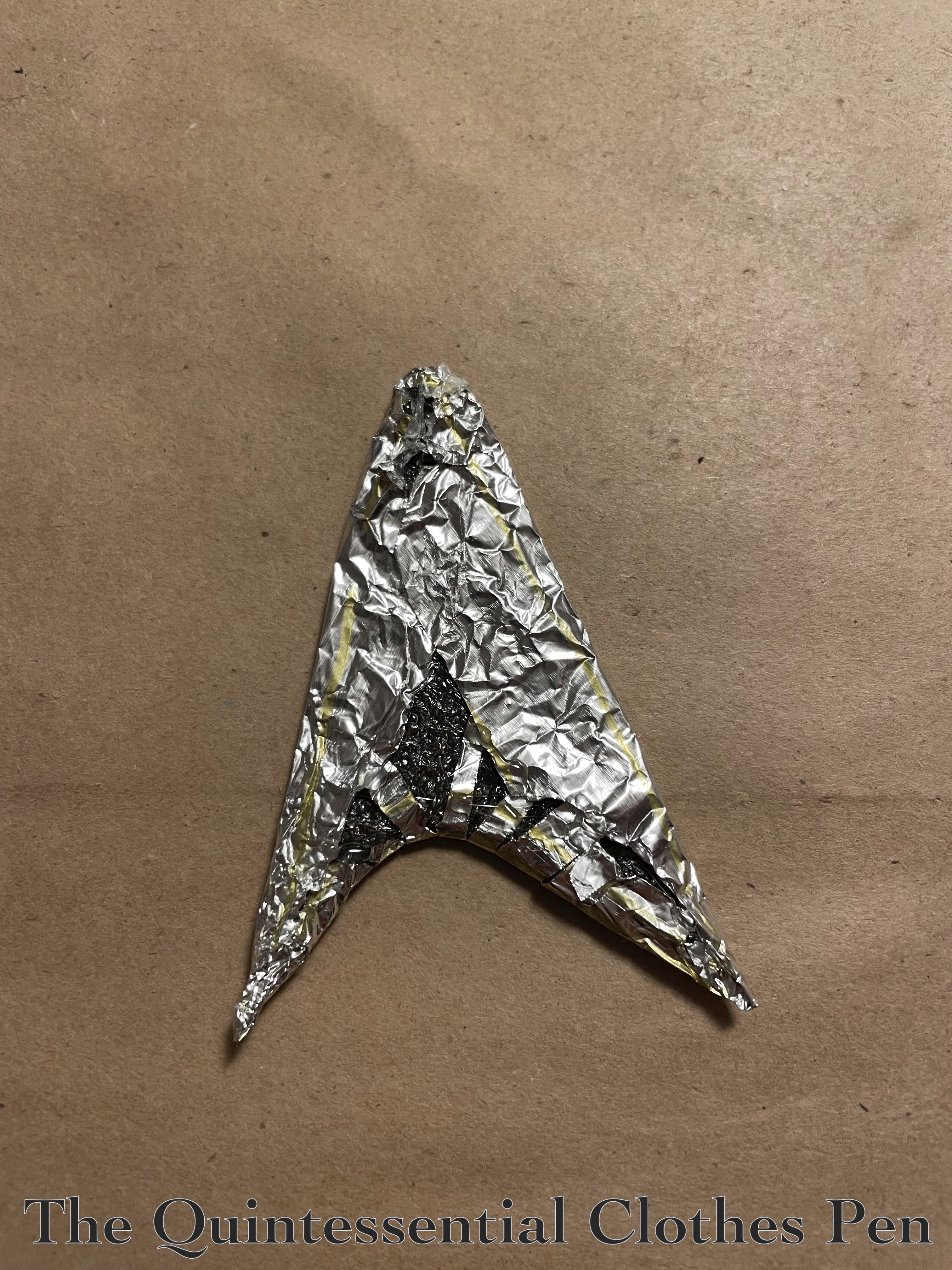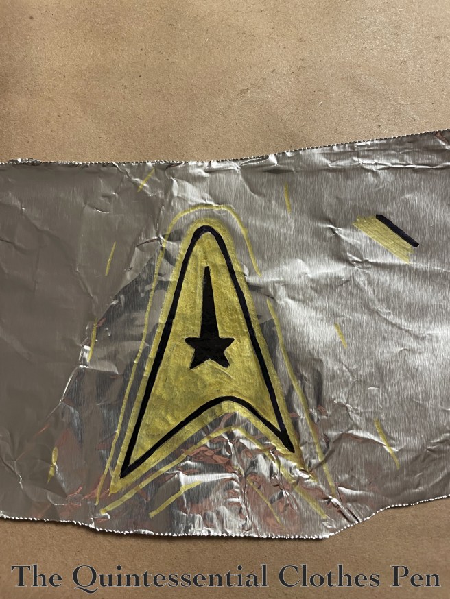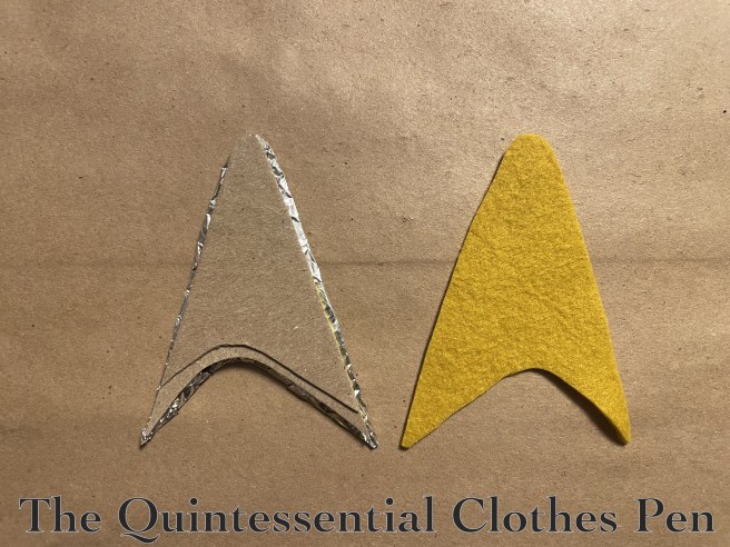 I only had a few days to make the dress and insignia happen and I didn’t want to spend any money, so I had to get creative. I was explaining my creative conundrum to Mr. Q and his response was: “if you can make a crown from produce clamshells then you can come up with a way” to make a Star Fleet insignia. I thought about it a bit… and came up with a plan!