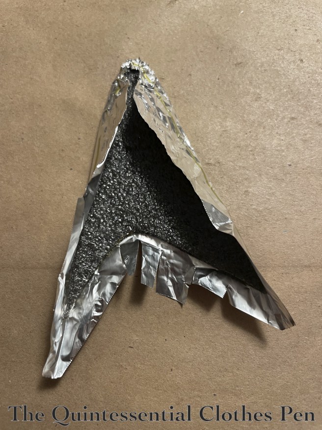 Then I cut out my shape, with seam allowance (as it were, since this is foil, not fabric!). I also cut out the shape (with no seam allowance) in a thin piece of foam, to give the insignia some body. I clipped into the curves of the foil, just as one would do with fabric, and folded the foil around the back of the foam. This was a bit tricky on the top point, bottom curve, and corners, but with some patience it was successful.