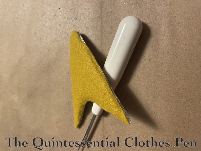 The dress already looked more like Star Trek! But, I also thought it needed the chest insignia. This can be a very deep rabbit hole. There are so many Star Trek series and styles, etc. My goal is not to delve into this in depth, but if you want to see examples or learn more about original series insignia, I found this blog post to be quite helpful: The Starfleet Insignia Explained.