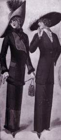 This garment is characterized by its romantic figure, featuring “pigeon breast” blousing and gracefully flaring skirts. The foundation of this shape is the new corset design introduced at the turn of the century, augmented by extra padding at the bust and rear. Tailored looks of this period separated jackets from skirts, but still these do not qualify as suits.