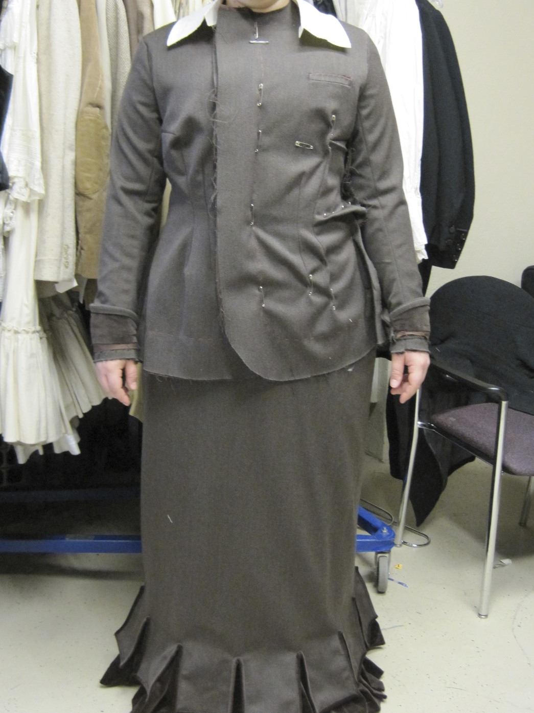 The jacket is the other exterior garment. This garment is actually a really good example of the alterations I almost always have to make before I am able to finish a garment. The left side is how the garment fit when I put it on my model. On the right side you can see all my safety pins moving and adding darts to make the jacket fit better. Although it looks wrinkly, once I stitch all those alterations it will actually allow the jacket to fit smoothly over the torso. You can also see my mockup collar on this jacket.