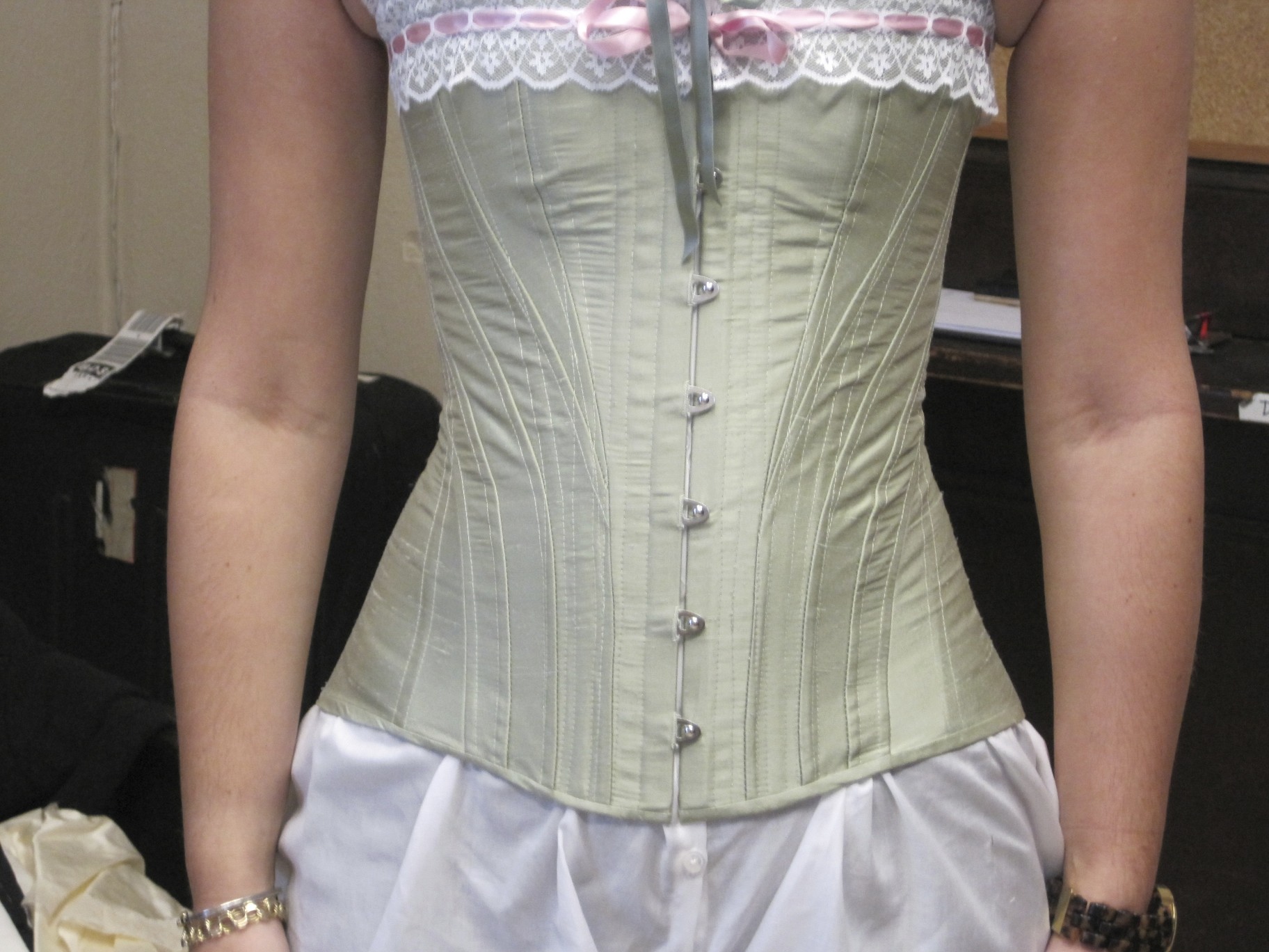There is also a cream colored corset cover that is not pictured in these photos. This s-shape corset is made of green silk shantung flat lined with coutil. The seams are flat felled on the inside. The edges are bound in bias cut shantung and the top is also edged with white lace threaded with pink silk ribbon. Under the corset is a cotton combination that buttons up the front. A combination is an undergarment that is functions as a chemise but has bifurcated leg openings, like drawers. This pair is edged in white lace at the leg openings and neck edge. The neck opening is threaded with a green silk ribbon to coordinate with the corset.