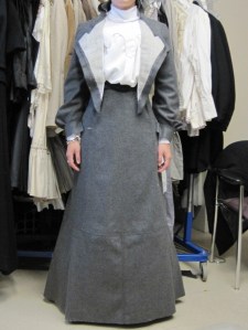 Well, if you remember from a few posts ago, I completed my mockup undergarments and exterior garments for this 1903 look in muslin (the same fabric I used for the 1883 and 1913 mockups). But now I’ve completed first fittings for my garments in their actual fabrics!