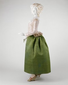 There are other options for this period as well: there is the style Robe a la Polonaise, which has a characteristic  bunching of fabric across the back side as well as the skirt and jacket combination. I’m not interested in making a Robe a la Polonaise at this point, but a skirt and jacket combination is a possibility. You can see these styles below. There is another style as well: the Chemise Dress, but you’ll have to wait for my next post to see and read about it!