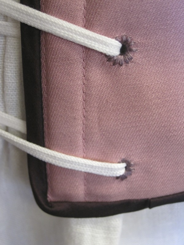 After completing the inside construction I bound the edges with purple bias silk taffeta, scraps from another project. The final step was to create eyelets. I decided to do these by hand in purple cotton embroidery floss. Each eyelet is reinforced with a metal jump ring that is caught under the thread on the inside of each eyelet. This reinforces the edge of each eyelet and keeps them from stretching out of shape when laced. The jump rings are only visible on the inside of the eyelets, where the stitching is bulkier because it passes over the rings.