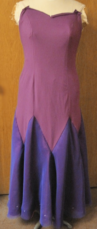 But anyway, progress: the bodice has been sewn and fit multiple times, the skirt godets have been sewn in, and there is a very invisible zipper sewn in center back (you can only see the zipper pull because it is pink instead of purple-ish)! Still to do before the rhinestones: serge all the skirt seams and hems (which I actually did after I took the pictures), finish the hems with plastic wire (which I did… it was disastrous looking! I hated it and it was so frustrating! so then I took it all out… I think I might try horsehair), finish the top edge of the bodice, sew the straps on… Once the rhinestones are on I still need to make floats (the usually chiffon pieces that hang off of the arms) and a neck decoration of some sort. I’m not sure what that will look like yet, but now I’ve got time to plan ahead!