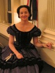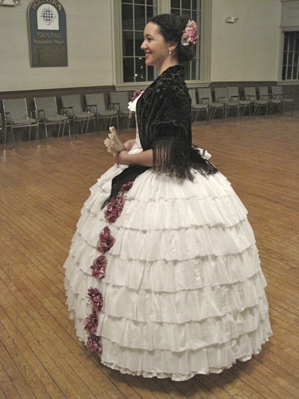 I also decided to rework the hair wreath I’d made for the German Cotillion back in October (left). I’m not sure I like it as a giant mass of flowers, I might rework it again into a crescent shape like the flower piece that matches Belle, my other 1860s ball gown (above right). In terms of the flowers, giant mass or crescent shape?