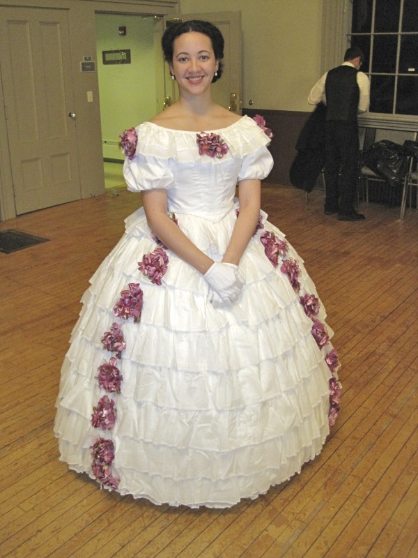 Alliterative, agreed? Ok, I’m done… Honestly, the words just came–I didn’t spend long on them! Last weekend I attended the Returning Heroes Ball hosted by the Commonwealth Vintage Dancers in Holliston, MA. As usual, it was full of fun and laughs. There were fabulous dresses all around (because of course one of the joys of a ball is to observe dresses–old and new) and wonderful refreshments as well. I don’t have pictures of other people, but I have pictures of me!… You can see a variety of people in the photos on Antonia’s blog, Experiments in Elegance…