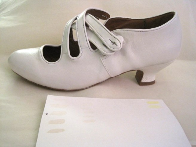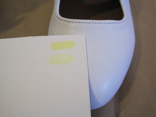 How did I go about painting them? Well, as I mentioned in my last post, I bought Angelus Leather Paint in three colors: yellow, white, and champagne. Technically, ivory is a very small amount of yellow diluted with mounds of white, but when I went to order the paint I had a great gut reaction thought that the champagne might make a better ivory than the yellow. It turns out that the yellow was just too strong! I made a little swatch card (so I could find the right shade of ivory, see what the shades looked like when dry, and so I could repeat the color if I needed to mix more paint). I tried the yellow first, and just one drop of yellow in a fair amount of white made a light yellow color, not at all similar to ivory!