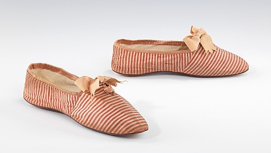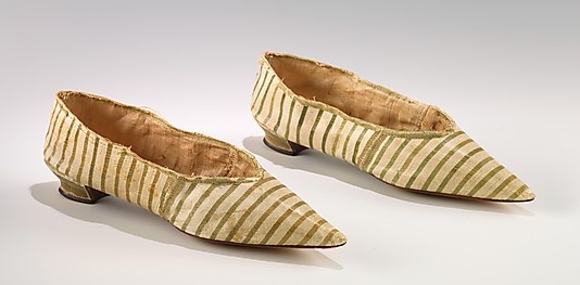 The 1870s striped shoes appeal the most to me, too: chic right across the years, I’d like some now! The little 1796 green and cream slippers are perfectly summery, though, and they are airily chic, too.