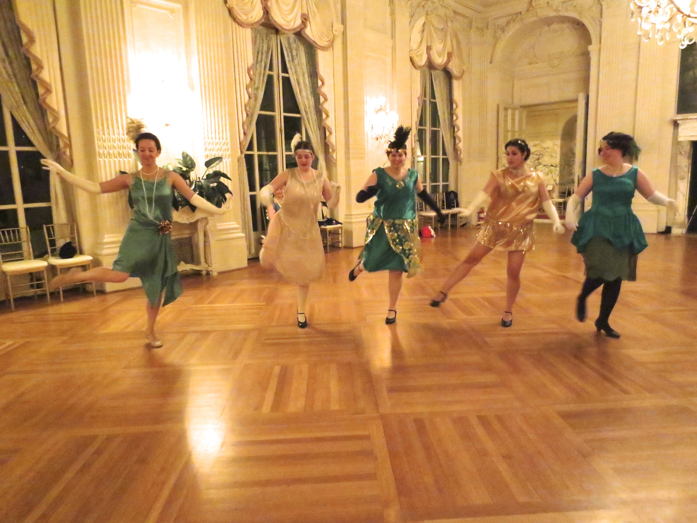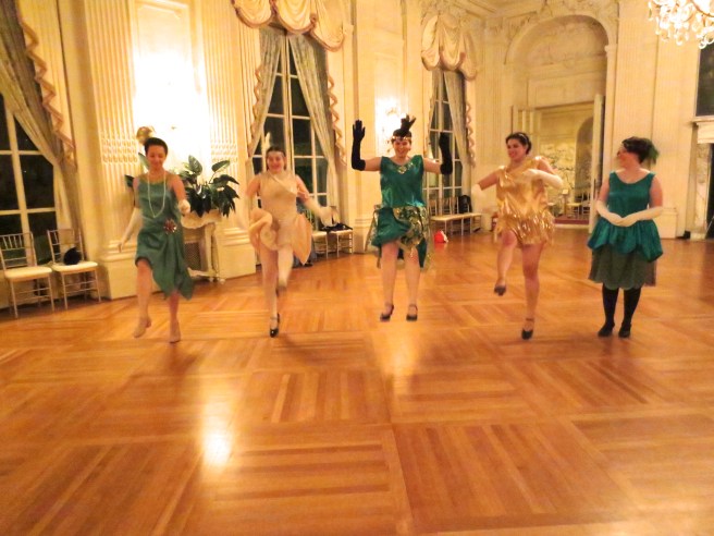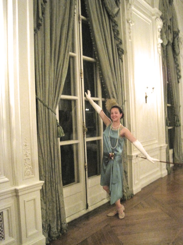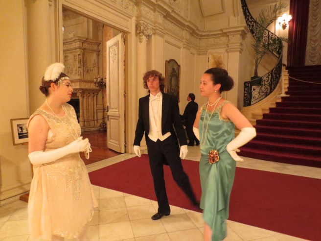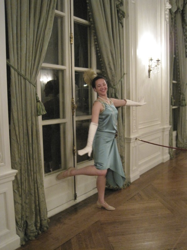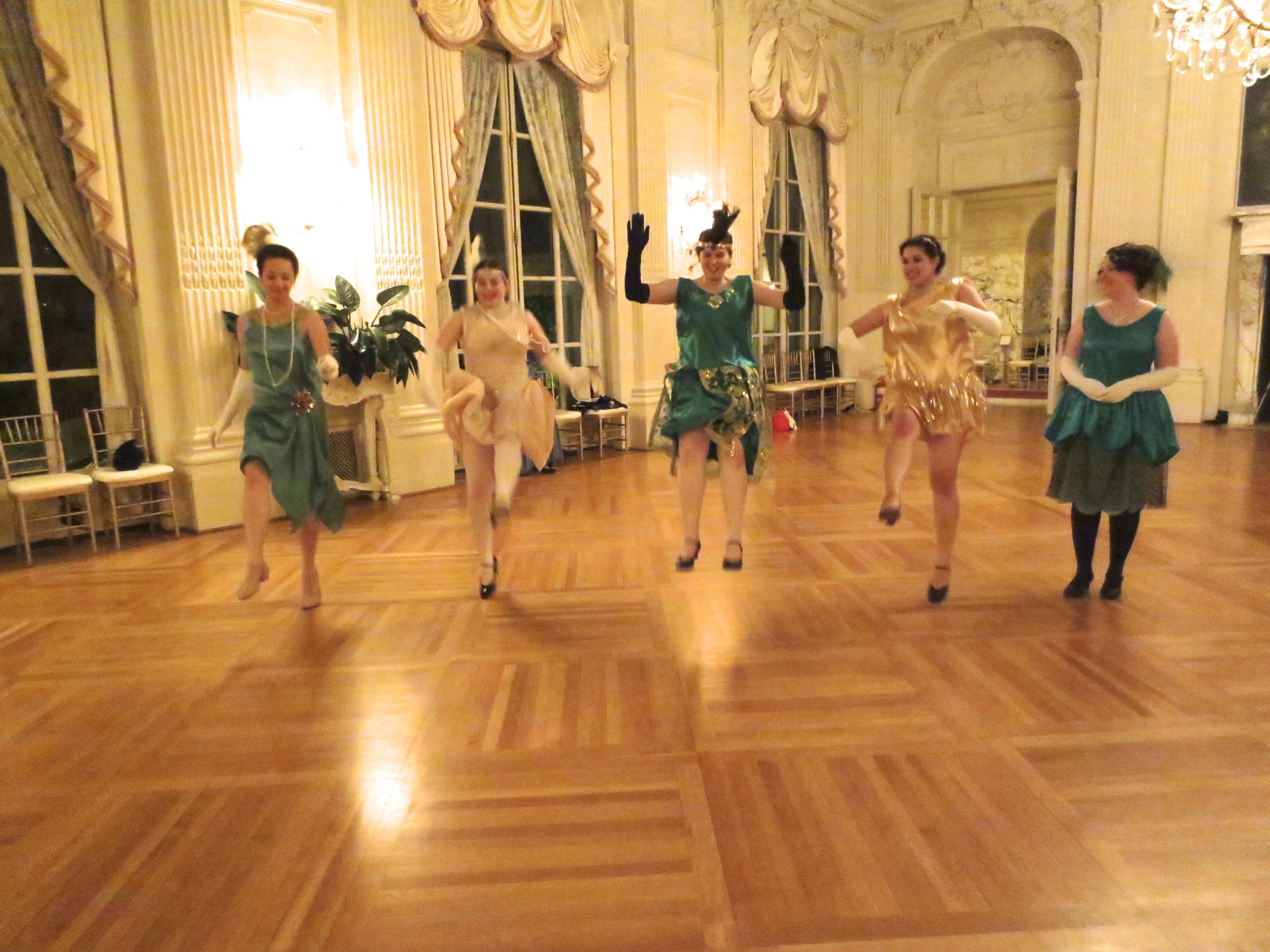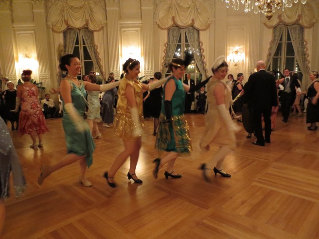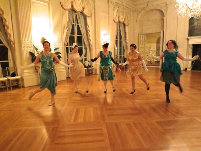 The staircase required lounging and looking elegant.More lounging… we lost a few people from the last shot. Oh well!Just practicing a bit of Charleston before entering the ballroom…I’m not sure what we’re discussing, but we look rather intent on the topic…The ceiling of the ballroom!The live orchestra (I believe this ball had music by the New River Orchestra).Looking in on the ballroom from the lovely patio.Contrary to the impression in the following pictures: there were actually lots of other people at the ball in addition to us…We really enjoyed the Charleston and more importantly, we enjoyed Charleston-ing together!More Charleston!Kicks and flying Charlestons were not to be left out! I am particularly amused that this picture captured some of us in midair!Look, we’re all kicking the same way at the same time! How cute!This became one of our signature dances for the week: Charleston in a line!It accompanied one of our other signature dances: the Raise the Roof Charleston (which I don’t think I have pictures of at this ball–but perhaps at another ball I’ll find some). Raise the Roof Charleston is simply regular Charleston footwork while raising the roof with your hands–it’s super silly and super fun!I think we took most of those Charleston pictures during mid-ball refreshment time, which is why the ballroom is empty behind us. But here is more proof that there were other people at the ball, too!There were other lovely rooms in addition to the ballroom that we could wander through… isn’t this one cosy?And this one, which is grand and fabulous! I love the curtains!Okay, part of my love of the curtains is related to my love of tassels, especially giant upholstery/drapery tassels!It was, of course, essential that I have my picture taken with the fabulous drapes!There were a lot of poses… this is only a few!Trading places: I’m behind the camera now…!Another view of the same room. Isn’t is wonderfully fabulous???Here I am, be-feathered, be-pearled, be-gloved, and enjoying the mirror doors!Mirrored doors are mesmerizing and fantastic photo opportunities! More feathers! More jewels! More pearls! More gloves! More awesome! (Moreadequate! Inside joke…)Just one of the many fabulous chandeliers hanging from one of the fabulous ceilings!