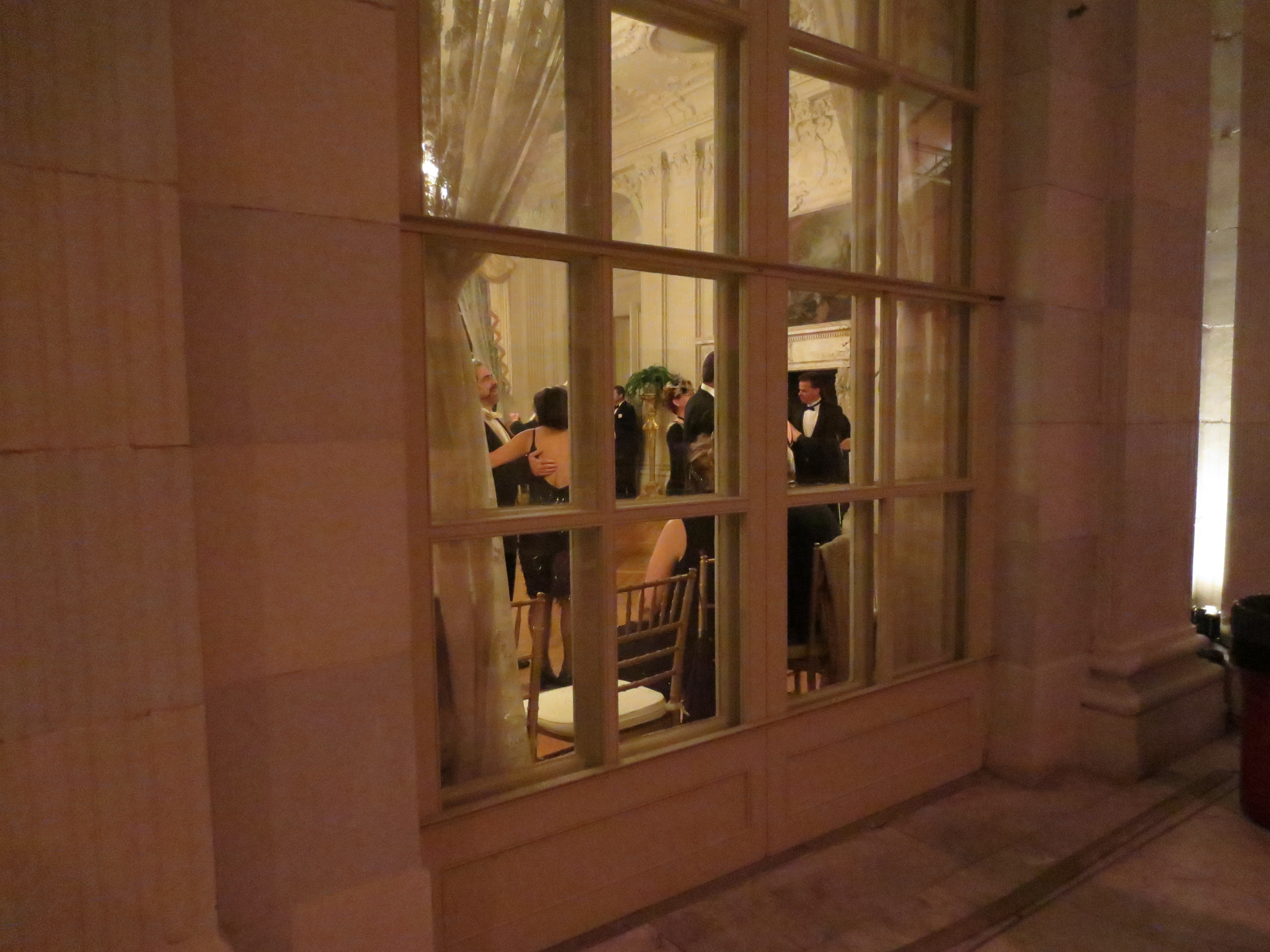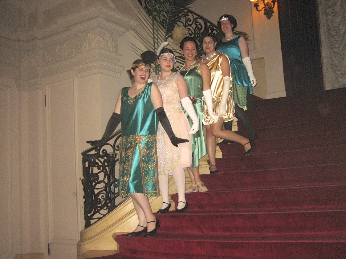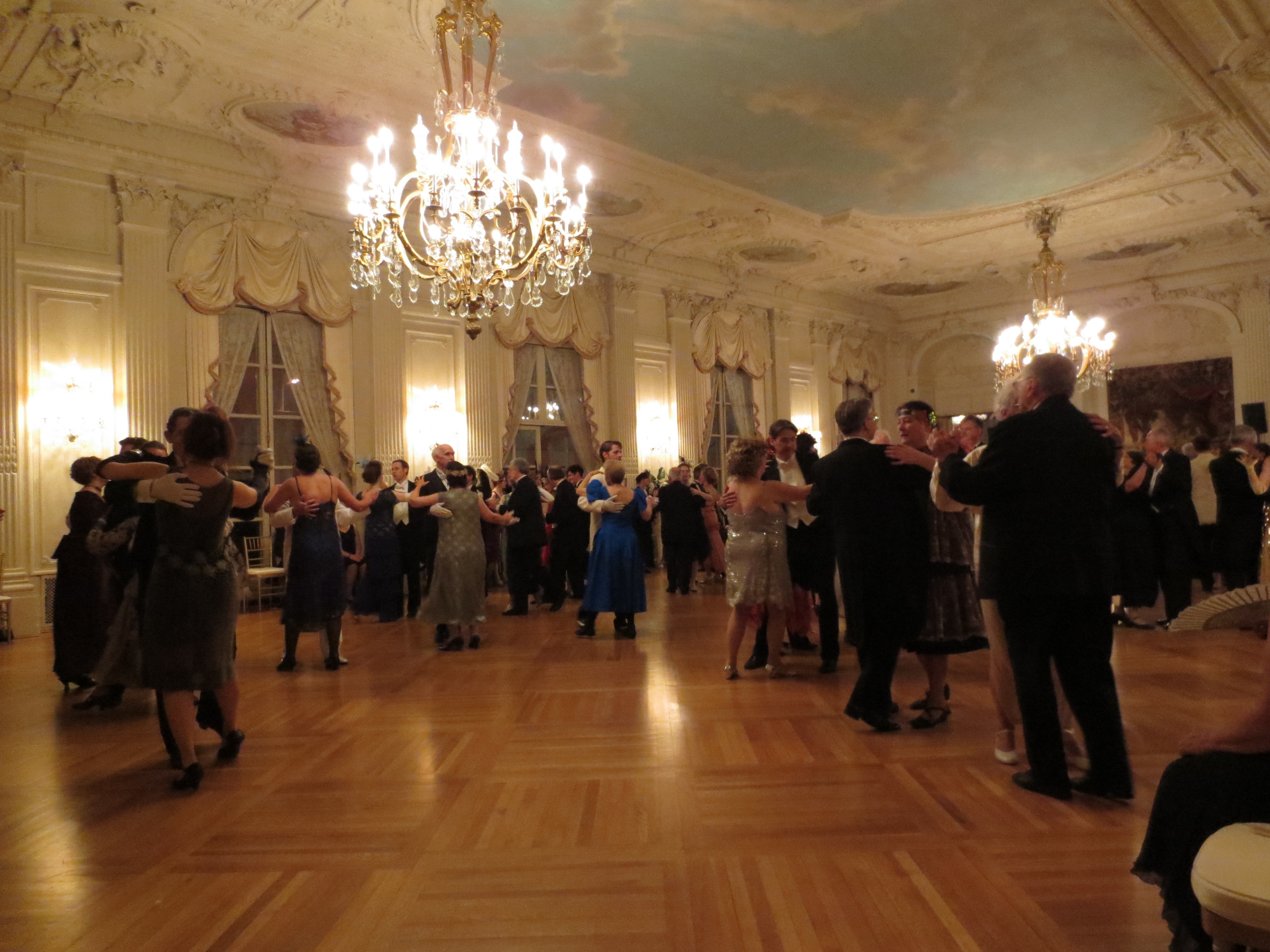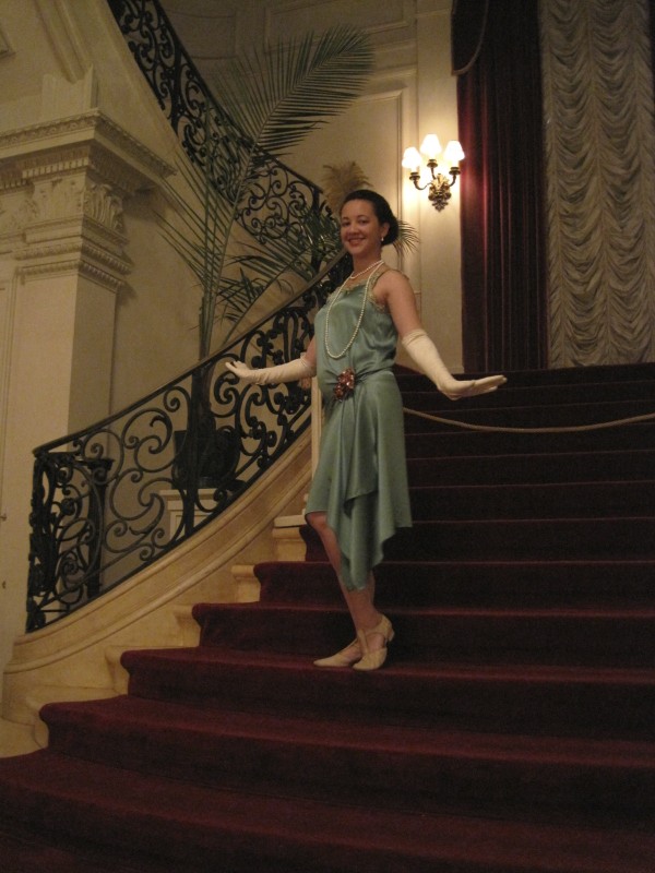 The staircase required lounging and looking elegant.More lounging… we lost a few people from the last shot. Oh well!Just practicing a bit of Charleston before entering the ballroom…I’m not sure what we’re discussing, but we look rather intent on the topic…The ceiling of the ballroom!The live orchestra (I believe this ball had music by the New River Orchestra).Looking in on the ballroom from the lovely patio.Contrary to the impression in the following pictures: there were actually lots of other people at the ball in addition to us…We really enjoyed the Charleston and more importantly, we enjoyed Charleston-ing together!More Charleston!Kicks and flying Charlestons were not to be left out! I am particularly amused that this picture captured some of us in midair!Look, we’re all kicking the same way at the same time! How cute!This became one of our signature dances for the week: Charleston in a line!It accompanied one of our other signature dances: the Raise the Roof Charleston (which I don’t think I have pictures of at this ball–but perhaps at another ball I’ll find some). Raise the Roof Charleston is simply regular Charleston footwork while raising the roof with your hands–it’s super silly and super fun!I think we took most of those Charleston pictures during mid-ball refreshment time, which is why the ballroom is empty behind us. But here is more proof that there were other people at the ball, too!There were other lovely rooms in addition to the ballroom that we could wander through… isn’t this one cosy?And this one, which is grand and fabulous! I love the curtains!Okay, part of my love of the curtains is related to my love of tassels, especially giant upholstery/drapery tassels!It was, of course, essential that I have my picture taken with the fabulous drapes!There were a lot of poses… this is only a few!Trading places: I’m behind the camera now…!Another view of the same room. Isn’t is wonderfully fabulous???Here I am, be-feathered, be-pearled, be-gloved, and enjoying the mirror doors!Mirrored doors are mesmerizing and fantastic photo opportunities! More feathers! More jewels! More pearls! More gloves! More awesome! (Moreadequate! Inside joke…)Just one of the many fabulous chandeliers hanging from one of the fabulous ceilings!