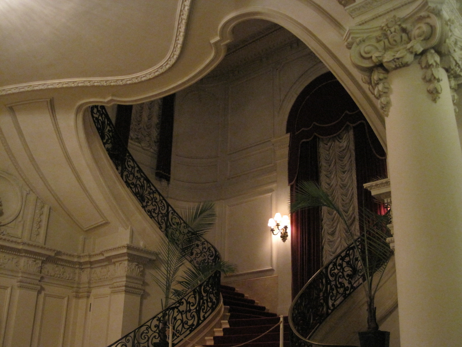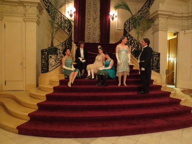 The setting: Rosecliff as we arrived in the twilight. (Rargh, lions!)Ready Newport? We’re here and it’s the 20s!The yawning red carpeted grand staircase just inside the entrance.It turns out that we were wearing complementing shades of green and gold!