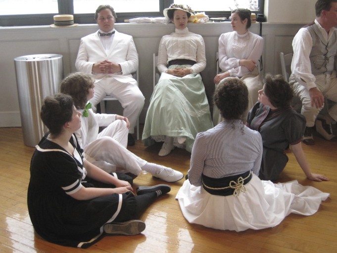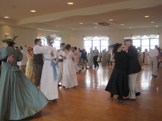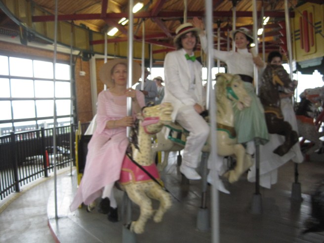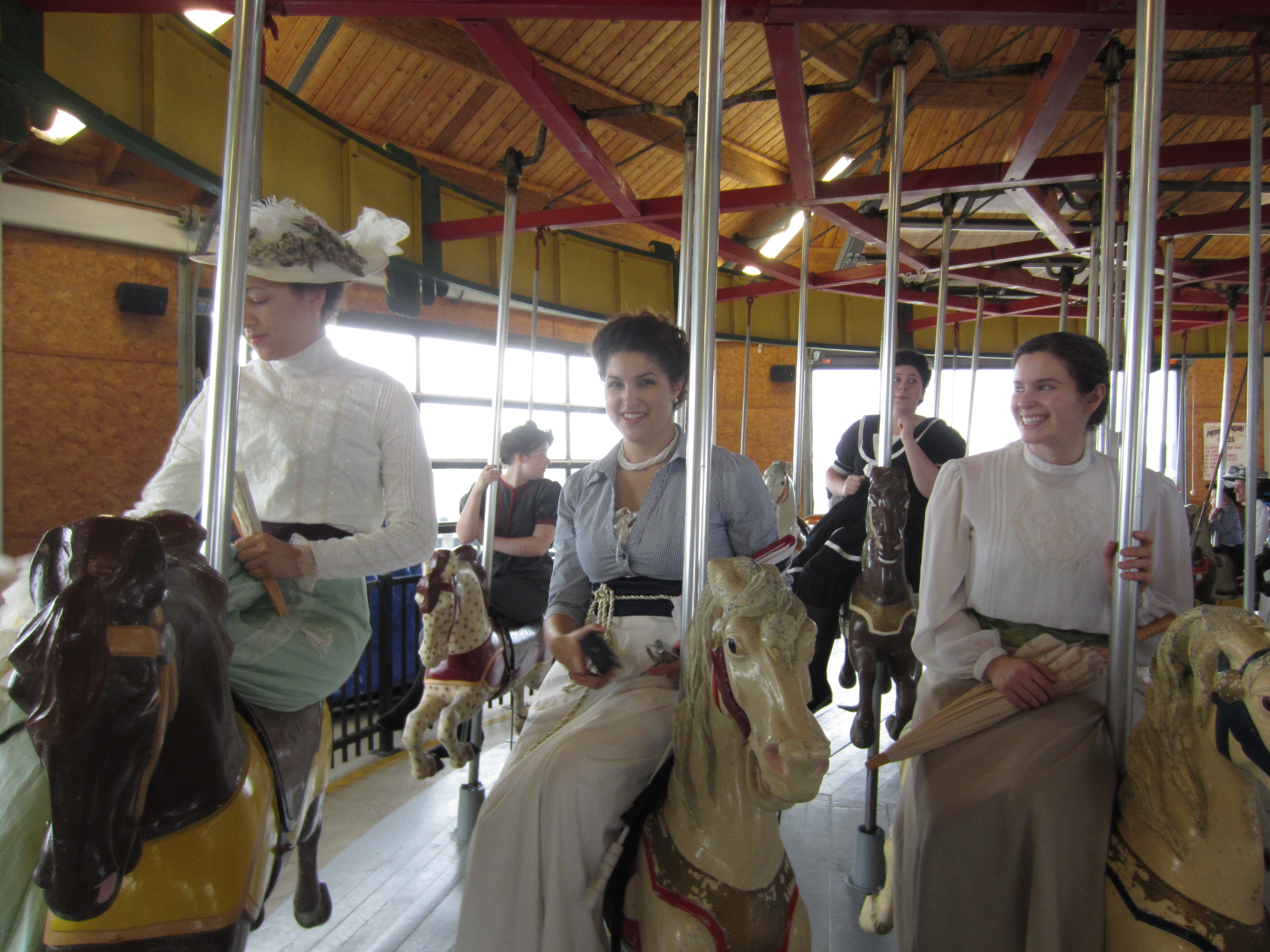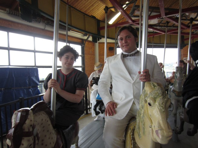 The Seaside Tea Dance took place on Tuesday. It was held at a venue right on the beach that also houses a operational carousel! In fact, the carousel was shut down for the public so that those of us at the ball might ride it with our other costumed companions. If you’ve ever been to Newport, this beach area is the one just down the hill from Bellevue Avenue (where many of the mansions are). Actually, many of the mansions along the left side of Bellevue Avenue actually have a view of the beach area where this event was held. The day events did not have specific time periods, thus you’ll see a variety represented in the pictures. It’s nice to be able to choose, but I enjoy the atmosphere most when everyone is wearing clothes from a short time span (as is the case at the formal evening balls).
