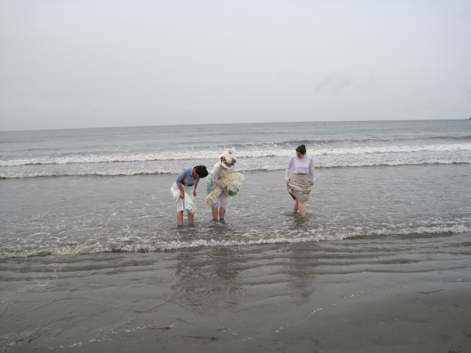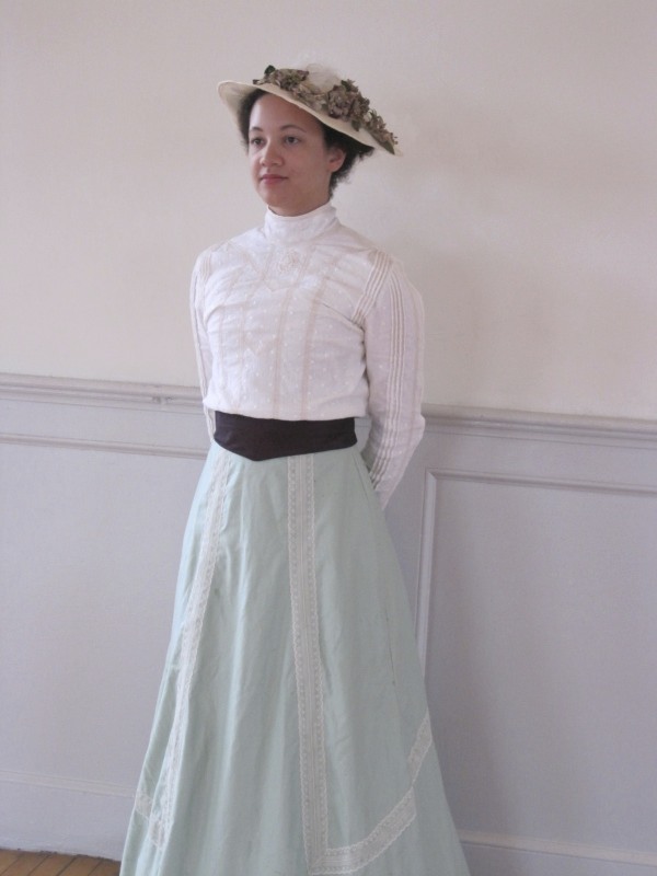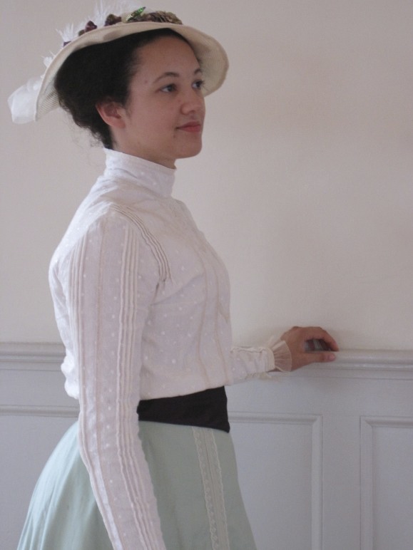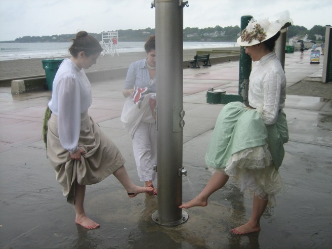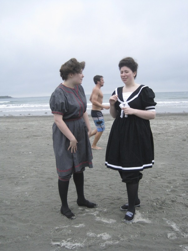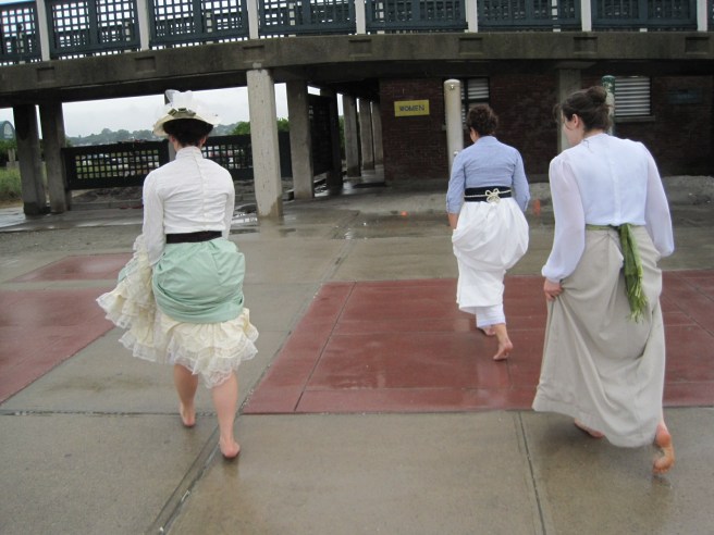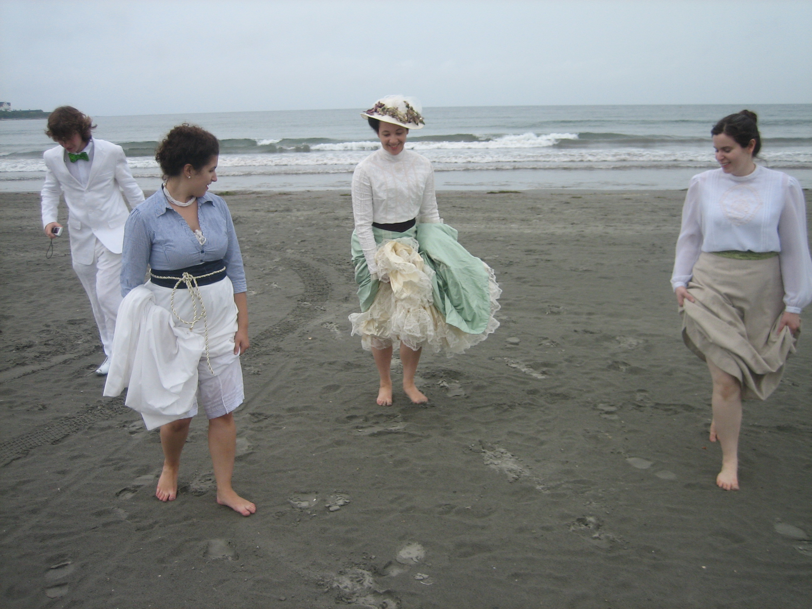 I hardly danced at this event–I wasn’t in the mood. BUT, I did ride the carousel!Carousel!Hm… not actually smiling, but with the same look on their faces.More of the fabulous young set…Being proper ladies, we were obligated to ride side saddle! (And you can see the back of my newly decorated hat.)Now you can see the front of my hat.This was ride number two. I was practicing my princess wave.As I mentioned in an earlier picture: we didn’t dance much. We did spend a lot of time sitting and discussing things (I don’t remember what things… I think mostly that we didn’t feel like dancing…). You can also see the fabulous knot I made on the blue belt! It was all pinned in place at the last minute, but I do like it.We, the young set, might not have been dancing, but that didn’t stop other people!If you’re going to wear matching bathing suits, you must take pictures on the beach!Oh no! The picture has been crashed by a random modern guy! Eep!Single occupant pictures are always essential.Here I am: 1900. New skirt, blouse from 1913 (shhh…), new belt, and newly trimmed hat (that appears to be listing to one side… oh well, it’s jaunty, right?).From the back.Close up. I love that I finally have a picture of this blouse that shows the details!Another good blouse shot. I can’t resist including lots of pictures of new clothes!Silly fun! We went wading in the ocean, in the rain! It was pretty warm, so the water didn’t feel cold.It is for spur of the moment events like this that it is always useful to wear historic underthings… You never know when your combination legs might be seen!Look, you can see one of our faithful cameramen!After getting our feet all sandy, we had to hose down a little bit.My ostrich feathers were rather bedraggled when we finally went inside… but I fluffed them and they dried looking just as wonderful as before the rainy sea adventure.Walking to the car. More petticoat ruffle is always better!