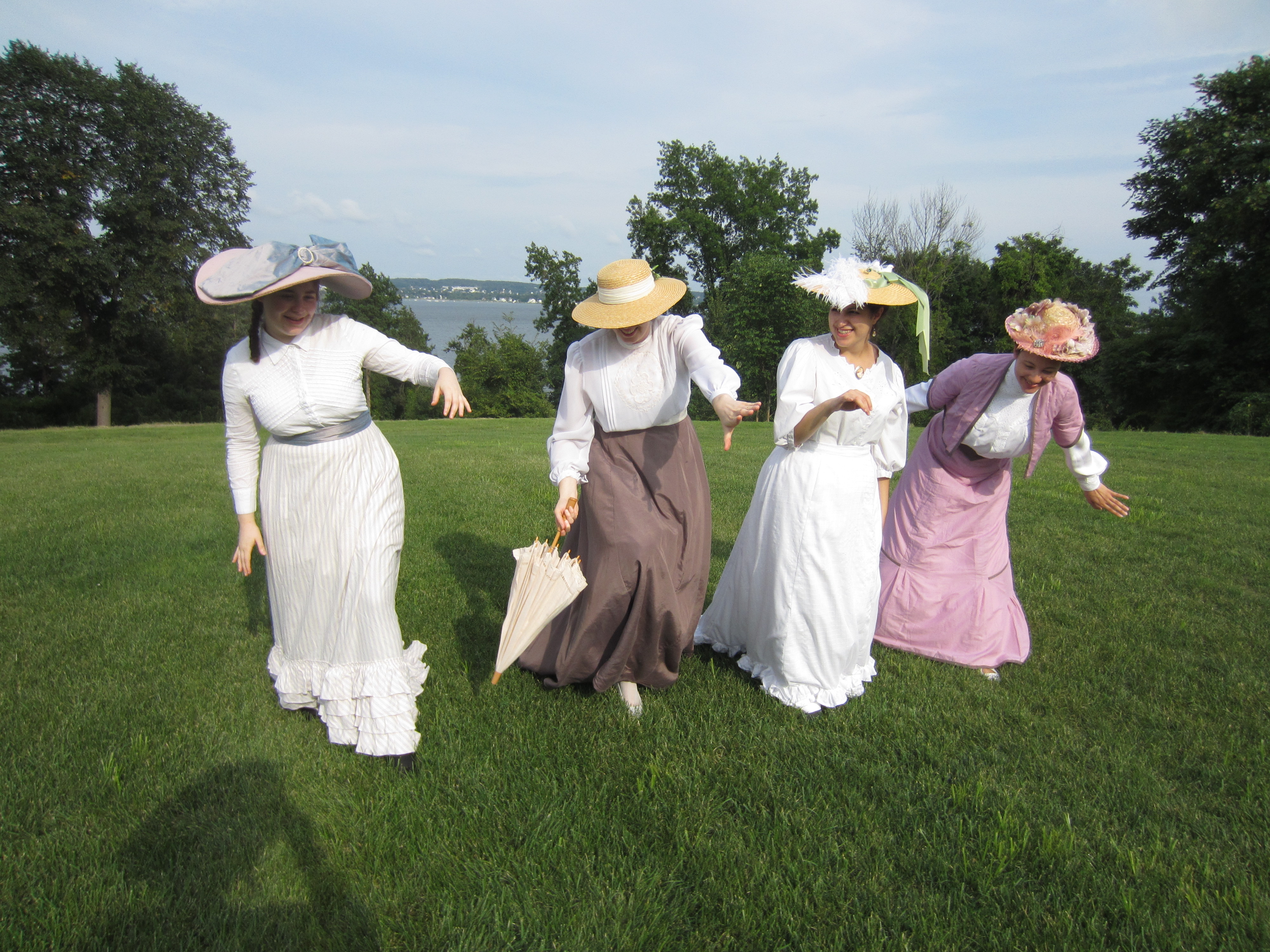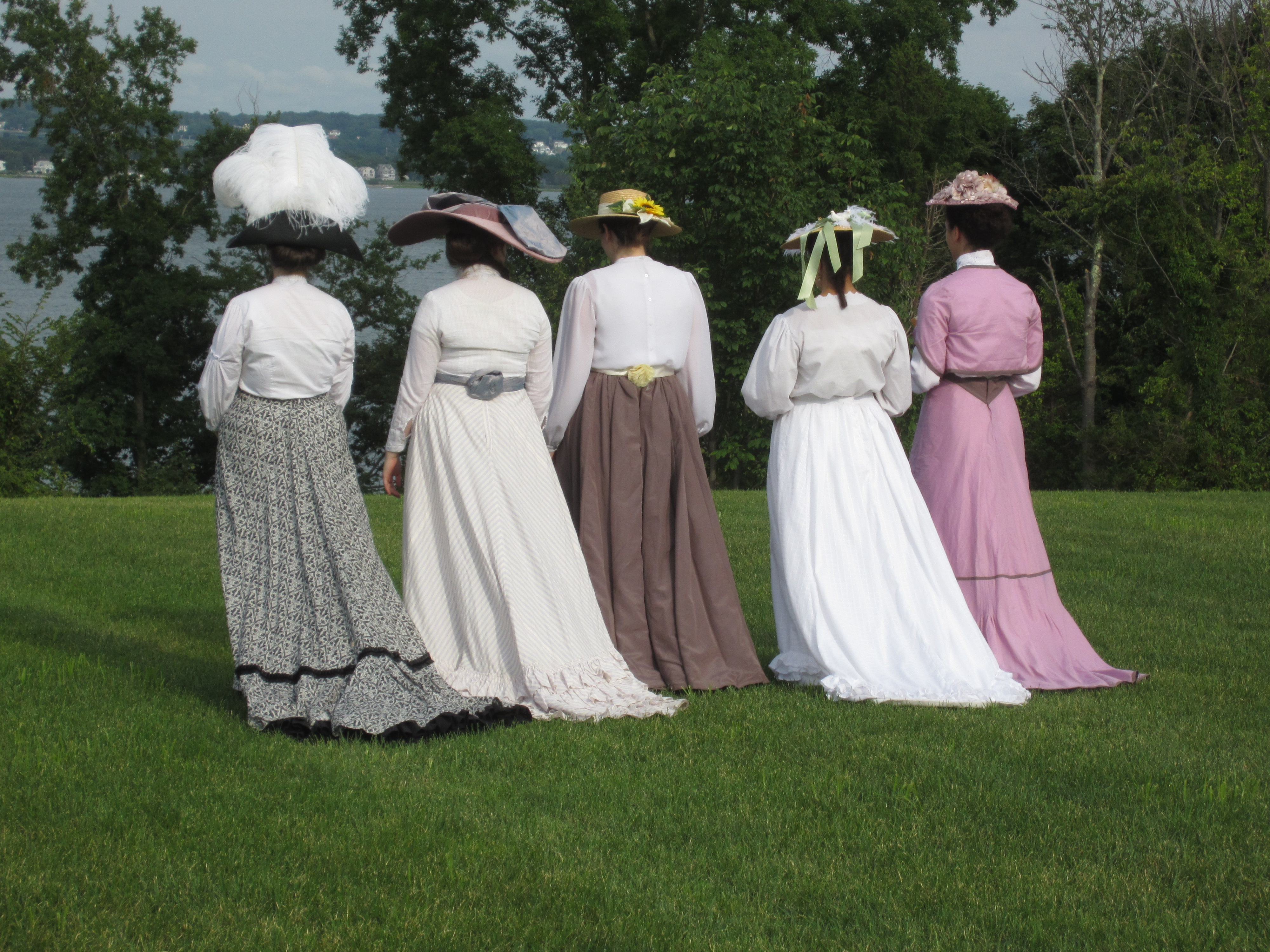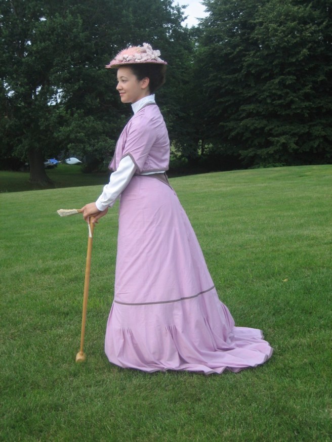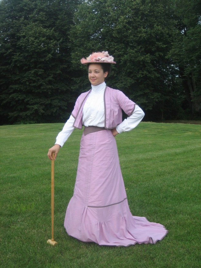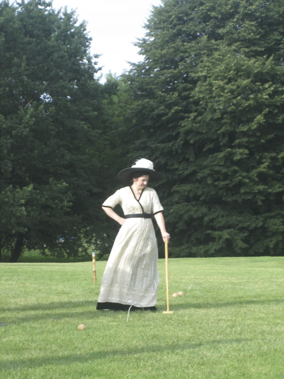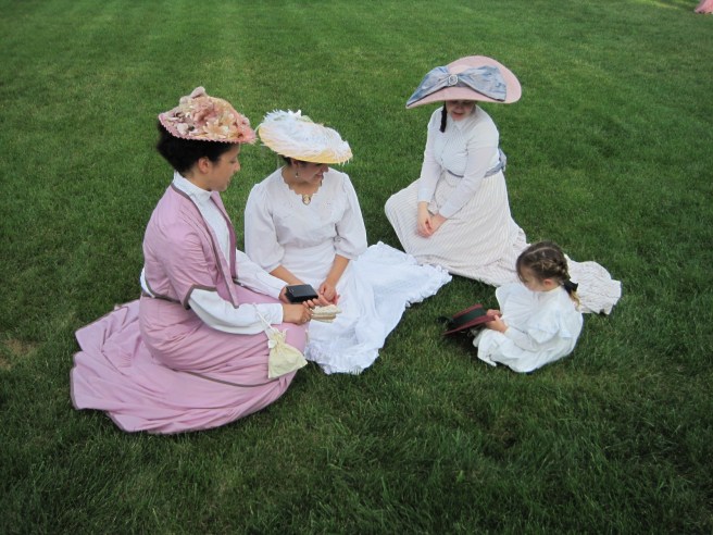 On our way to the official lawn for the tea, we stopped to take pictures here by the boats.Here I am: 1903. The blouse was made last year and the skirt earlier this summer (though I haven’t posted about that yet…). The bolero and hat were additions to complete the look.A side view. You can really see the silhouette.It’s like Where’s Waldo. Can you spot one of our faithful photographers caught on camera? He blends in with the boats.Another beautiful distraction before we even made it to tea.I wish there weren’t modern buildings behind the pond… but there were fish in pond!Looking picturesque. Again with the modern buildings…Close up. Such a lovely line with the skirt and all! And the buildings are much less obvious.Finally we stopped getting distracted and made it to the tea, where we saw this lovely group of people playing croquet!This is only the beginning of the croquet poses…So we didn’t actually play croquet… we just borrowed the mallets for our photos!Throw them over your shoulder?Hard to see that they are different lengths in the last photo, but not in this one!The long one was great for striking a pose that didn’t involve bending over.I rather like this pose.I’ve whittled it down to just this one close up hat picture…We got our young ladies together to take pictures in a line. We do love back side photos!Swirling skirts and stunning backgrounds. What more could we ask for?Silly moment! We like to try and walk toward the camera slowly, which always means walking like we’re either zombies or underwater, depending on your inclination.Awww. Aren’t they lovely together? Look at those trains!The neat looking knot-thing to finish off this particular sash–finishing off sashes in neat ways this was a theme of the week for me!Sitting with one of the little girls for a photo. We had to bribe her with lemonade… shhh!It’s possible that we were also distracted by cattails on our way out…I really wanted to reach them, but they were just out of reach.So lovely!We had to return to reality–the modern world. But did we walk on the sidewalk? NO! Up the middle of the road is the only way.More silly! Lifting the skirts and walking is always essential for sillyness. We are on our way to get ready for the evening 1860s ball at Ochre Court!