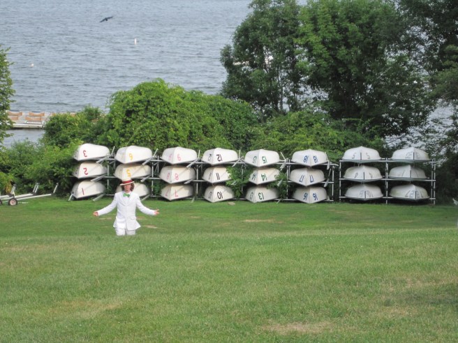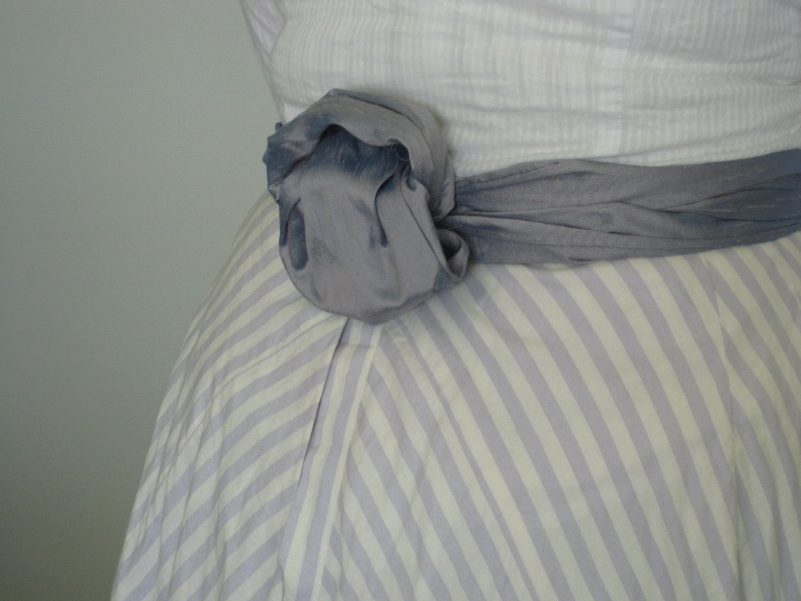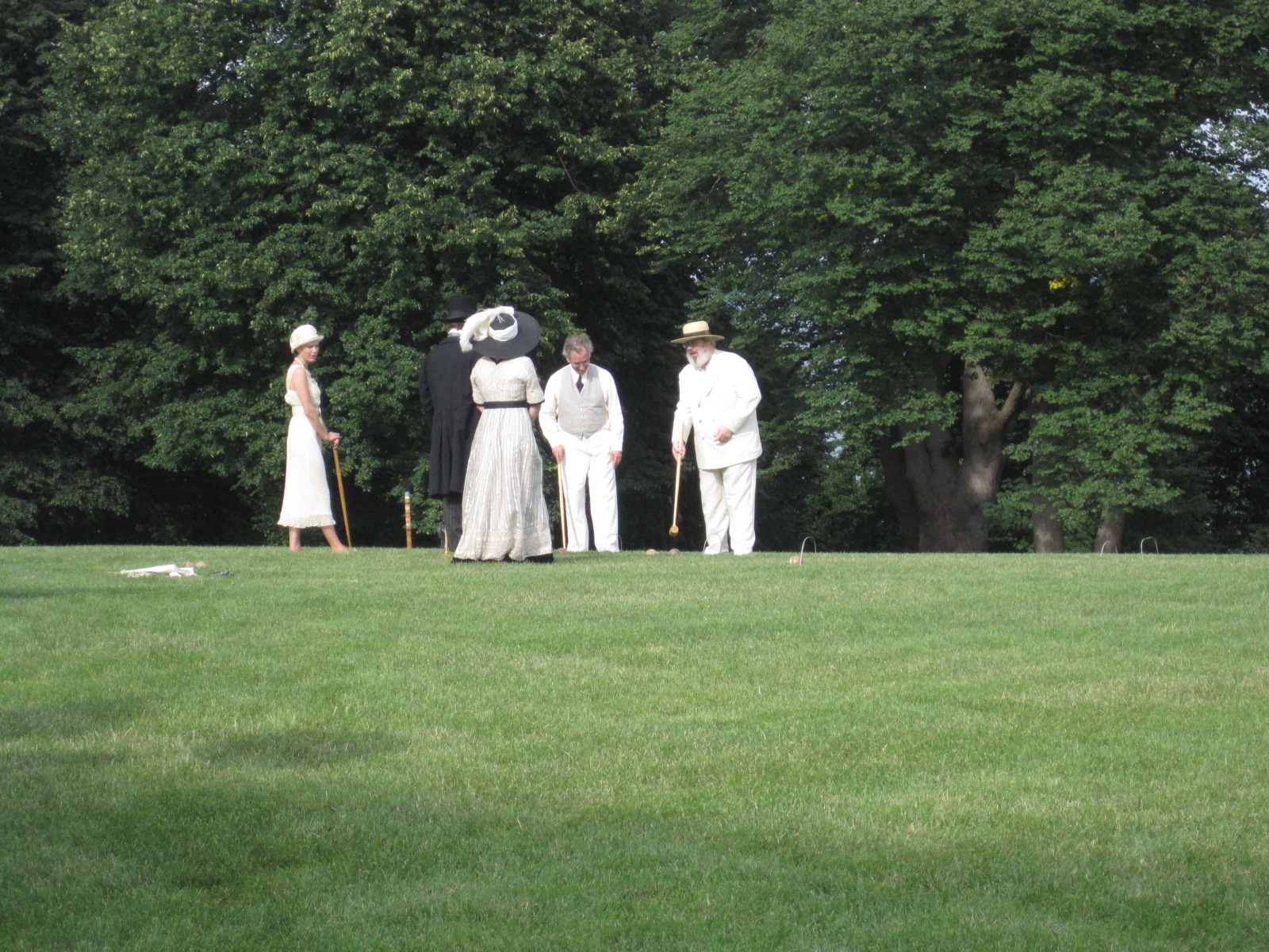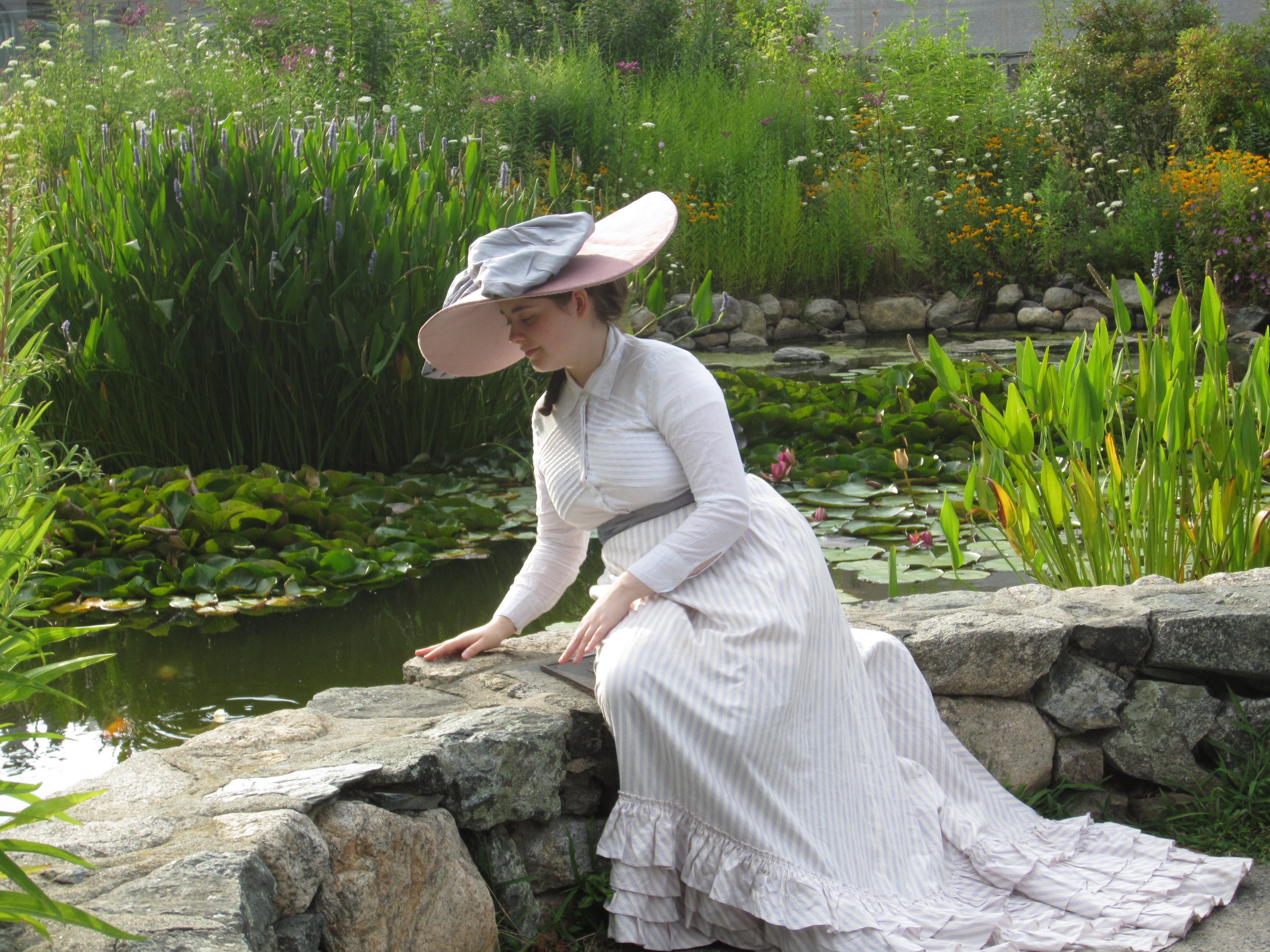On our way to the official lawn for the tea, we stopped to take pictures here by the boats.Here I am: 1903. The blouse was made last year and the skirt earlier this summer (though I haven’t posted about that yet…). The bolero and hat were additions to complete the look.A side view. You can really see the silhouette.It’s like Where’s Waldo. Can you spot one of our faithful photographers caught on camera? He blends in with the boats.Another beautiful distraction before we even made it to tea.I wish there weren’t modern buildings behind the pond… but there were fish in pond!Looking picturesque. Again with the modern buildings…Close up. Such a lovely line with the skirt and all! And the buildings are much less obvious.Finally we stopped getting distracted and made it to the tea, where we saw this lovely group of people playing croquet!This is only the beginning of the croquet poses…So we didn’t actually play croquet… we just borrowed the mallets for our photos!Throw them over your shoulder?Hard to see that they are different lengths in the last photo, but not in this one!The long one was great for striking a pose that didn’t involve bending over.I rather like this pose.I’ve whittled it down to just this one close up hat picture…We got our young ladies together to take pictures in a line. We do love back side photos!Swirling skirts and stunning backgrounds. What more could we ask for?Silly moment! We like to try and walk toward the camera slowly, which always means walking like we’re either zombies or underwater, depending on your inclination.Awww. Aren’t they lovely together? Look at those trains!The neat looking knot-thing to finish off this particular sash–finishing off sashes in neat ways this was a theme of the week for me!Sitting with one of the little girls for a photo. We had to bribe her with lemonade… shhh!It’s possible that we were also distracted by cattails on our way out…I really wanted to reach them, but they were just out of reach.So lovely!We had to return to reality–the modern world. But did we walk on the sidewalk? NO! Up the middle of the road is the only way.More silly! Lifting the skirts and walking is always essential for sillyness. We are on our way to get ready for the evening 1860s ball at Ochre Court!
