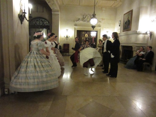 As you may already know if you’ve been reading this blog for awhile, the 1860s are my favorite period. I get super excited about them–especially the clothes! So you can imagine my absolute joy at being able to attend an 1860s ball during Newport Vintage Dance Week. But to make things even more amazingly wonderful, this particular ball was held in one of the most beautiful places we visited during the week! You can see pictures of last year’s 1860s Ochre Court Newport ball here, in an earlier post. In fact, Ochre Court is my favorite of any Newport venues I have ever entered, except maybe the Breakers… but we didn’t have a ball at the Breakers (because it is no longer open to the public, as far as I know), so for Newport 2012, Ochre Court was my top most favorite place!