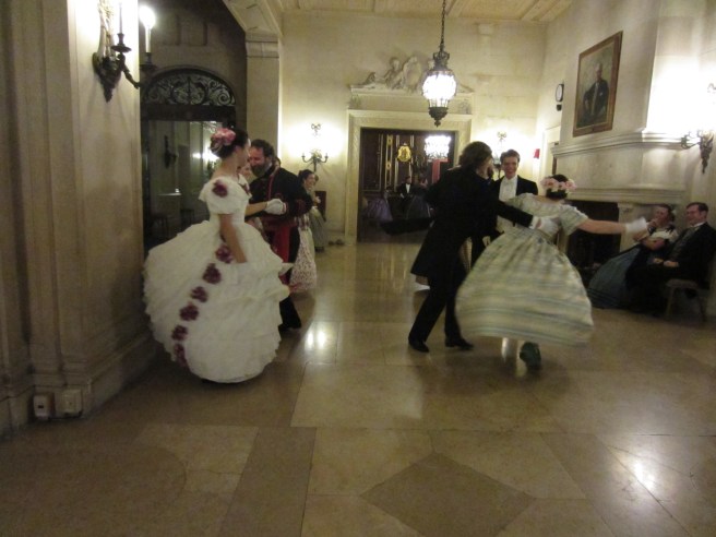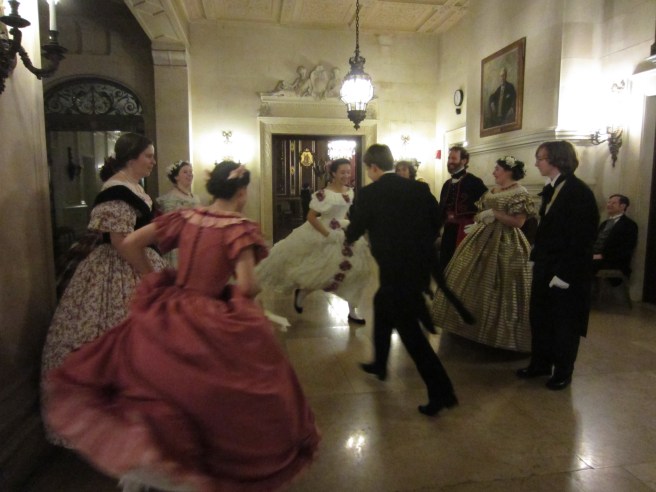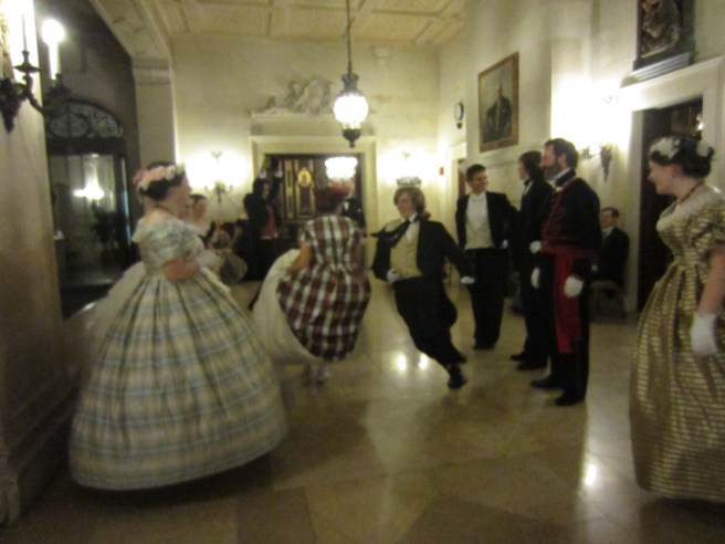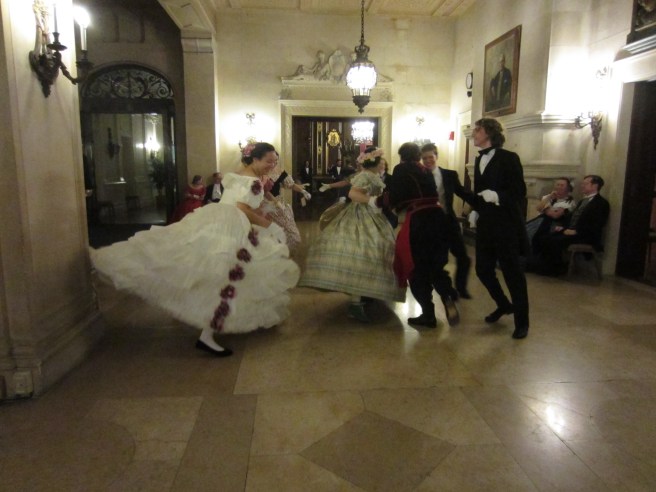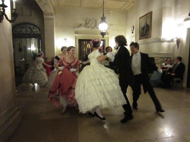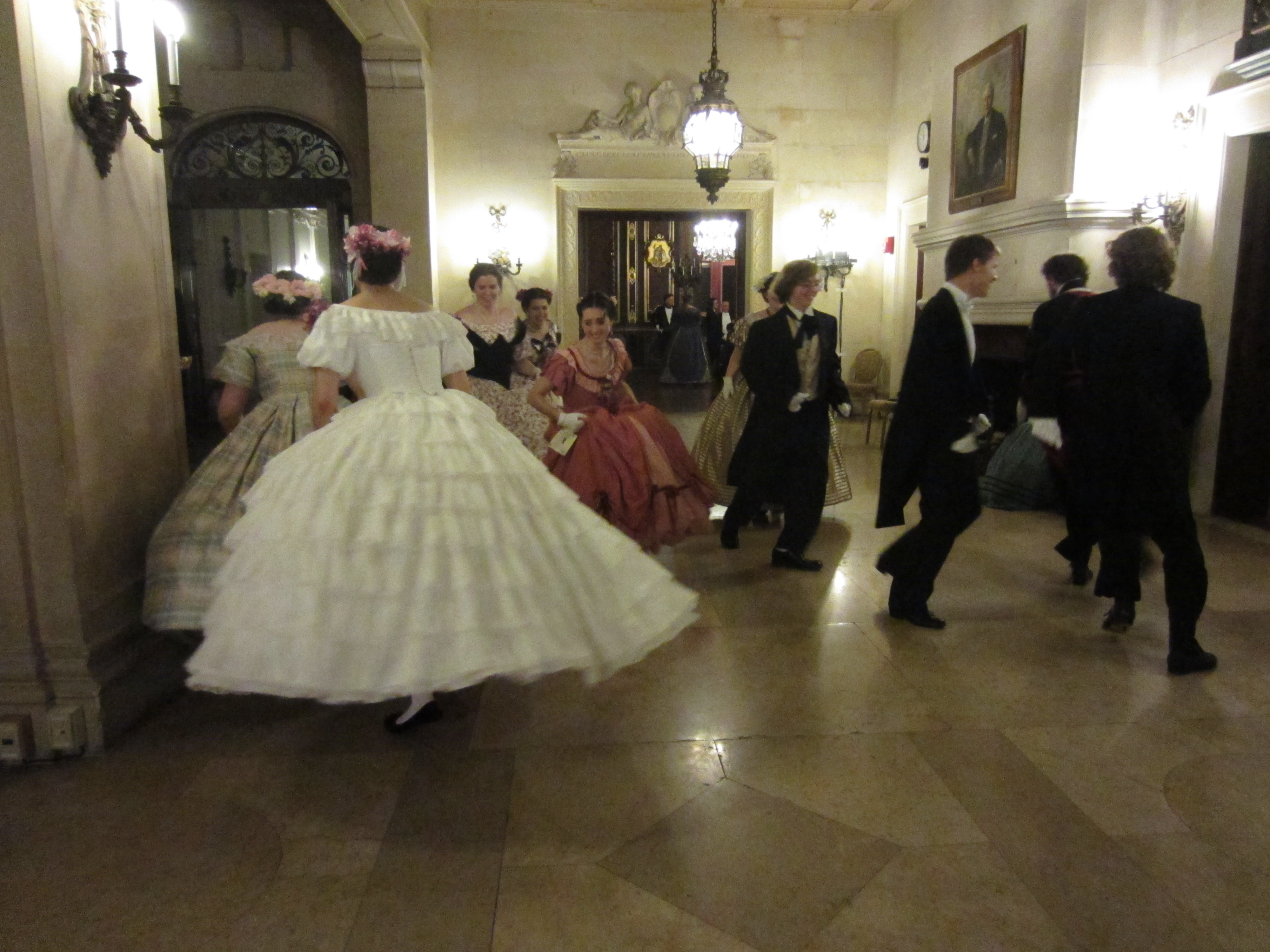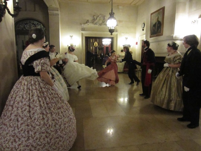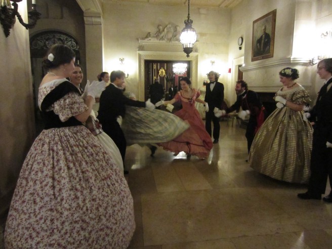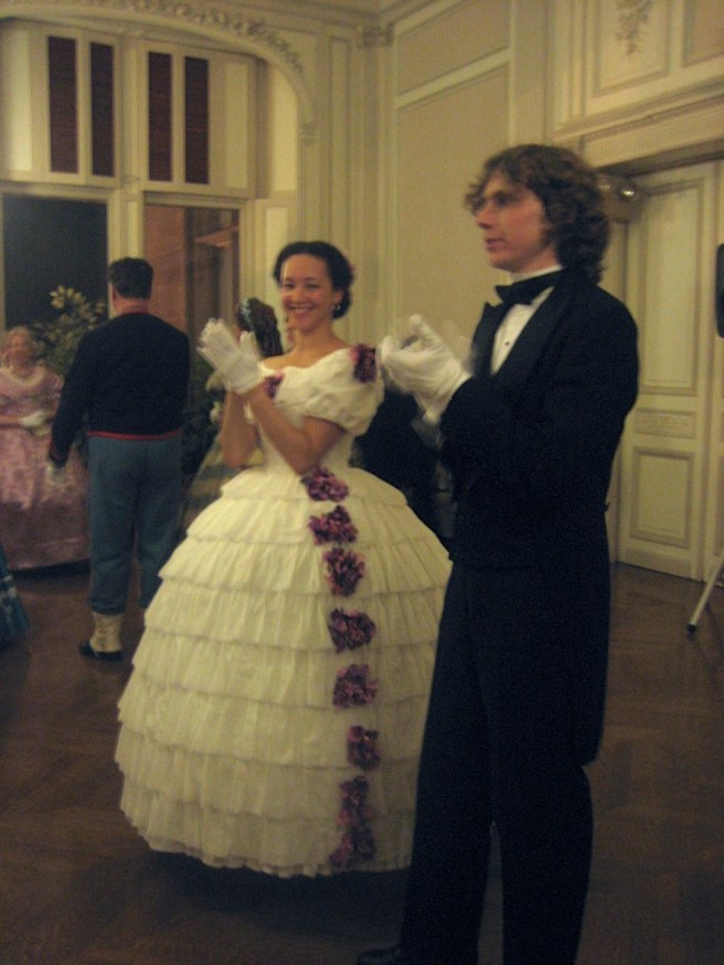 I hope so, because it was some of the most fun we young people had at this particular ball! It included many sweeping hoop skirts showing scandalous views of ladies’ drawers as well as a slide and fall on her bottom by none other than me! Unfortauntely, there are no pictures of me actually on the floor, so you’ll have to take my word for it (and I’m sure my fellow dancers would back me up!). Lucky for me I had two factors in my favor such that I didn’t hurt myself at all: 1-I wear a pretty hefty bum pad with my 1860s clothes to help my hoop stay paralell to the floor (I’m pretty sure I landed on this, because the floor is marble, and the fall didn’t hurt) and 2-there was so much adrenaline going around that even if it did hurt I didn’t feel it…I remember lying on the floor thinking “Yikes, I am lying on the floor,” and then jumping up again and continuing the dance! This dance was so much fun I really couldn’t rule out very many pictures, so I do hope that you don’t mind seeing a lot of Speed Virginia Reel, the all new 1860s dance craze!