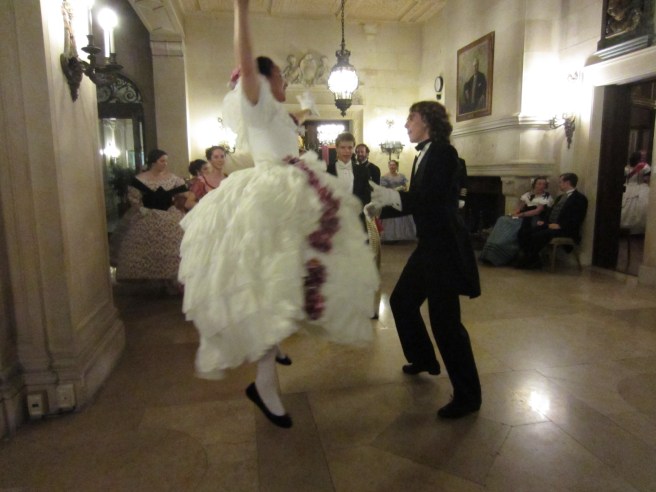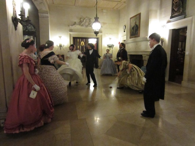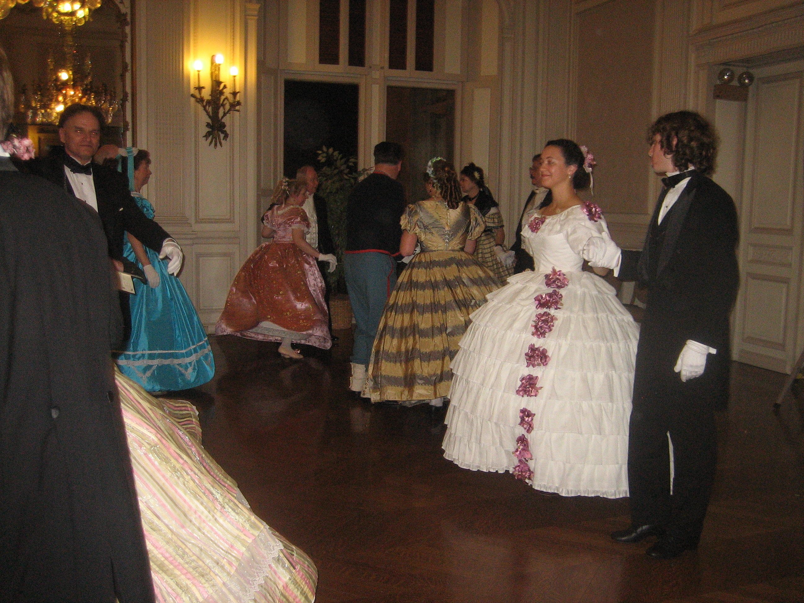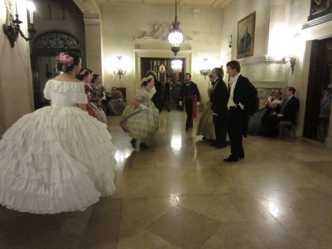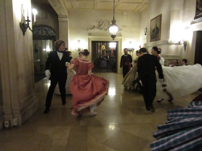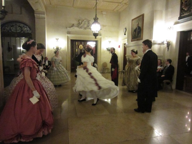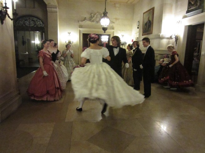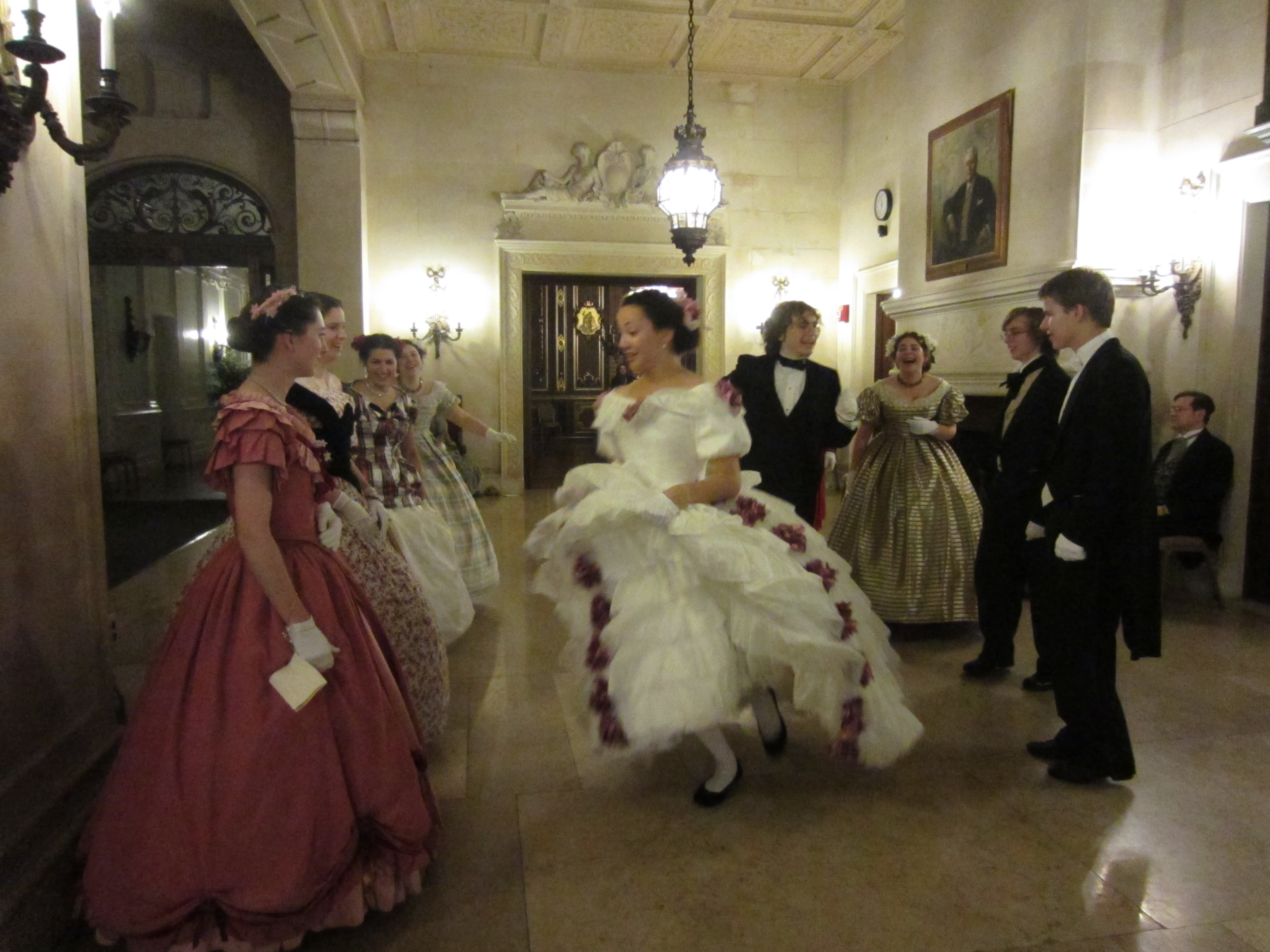 I hope so, because it was some of the most fun we young people had at this particular ball! It included many sweeping hoop skirts showing scandalous views of ladies’ drawers as well as a slide and fall on her bottom by none other than me! Unfortauntely, there are no pictures of me actually on the floor, so you’ll have to take my word for it (and I’m sure my fellow dancers would back me up!). Lucky for me I had two factors in my favor such that I didn’t hurt myself at all: 1-I wear a pretty hefty bum pad with my 1860s clothes to help my hoop stay paralell to the floor (I’m pretty sure I landed on this, because the floor is marble, and the fall didn’t hurt) and 2-there was so much adrenaline going around that even if it did hurt I didn’t feel it…I remember lying on the floor thinking “Yikes, I am lying on the floor,” and then jumping up again and continuing the dance! This dance was so much fun I really couldn’t rule out very many pictures, so I do hope that you don’t mind seeing a lot of Speed Virginia Reel, the all new 1860s dance craze!