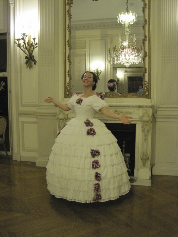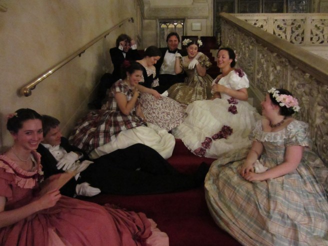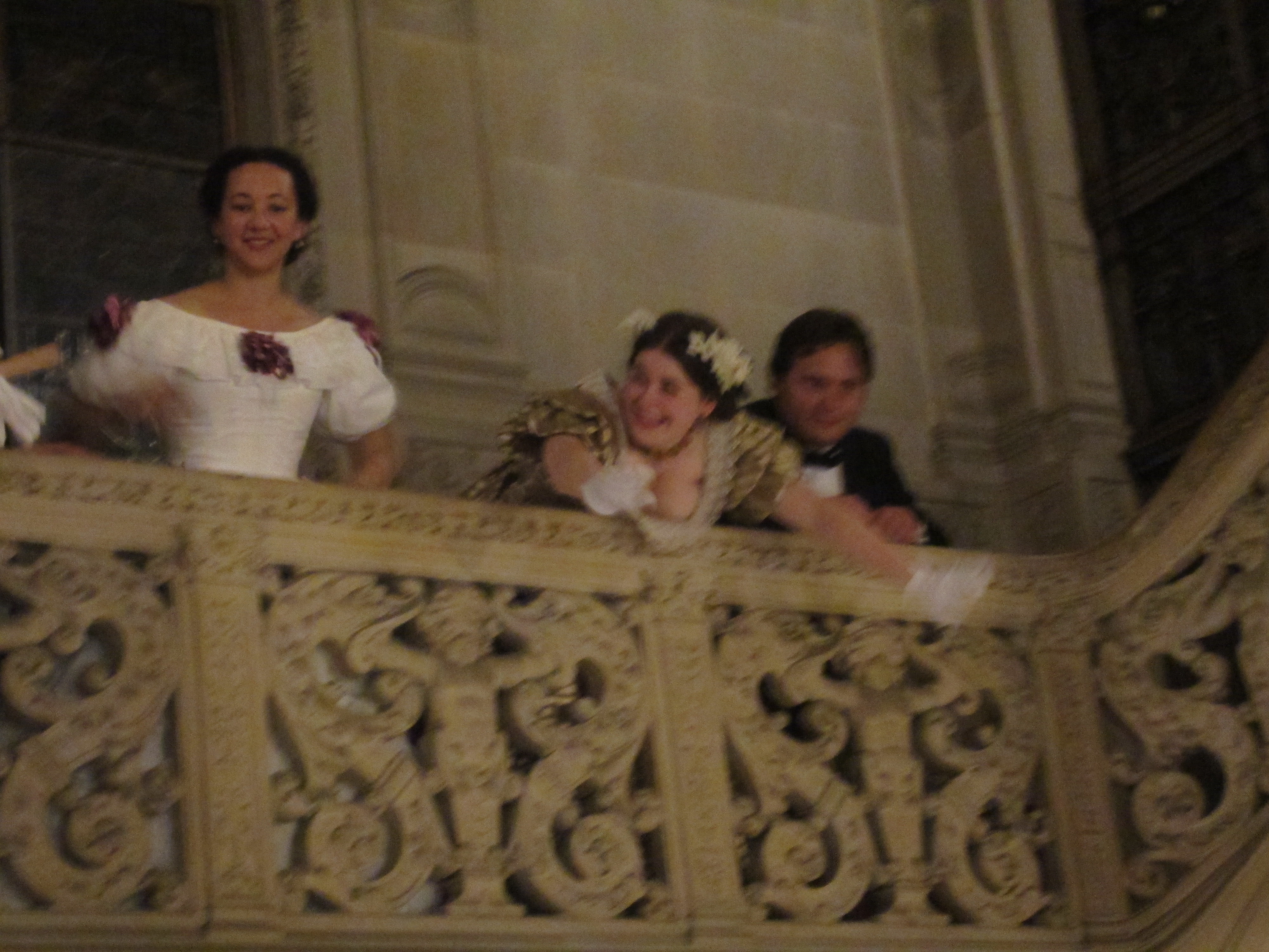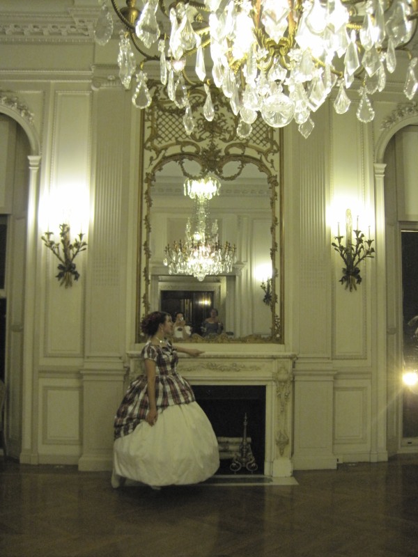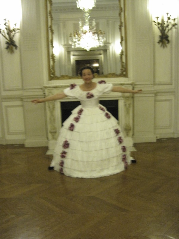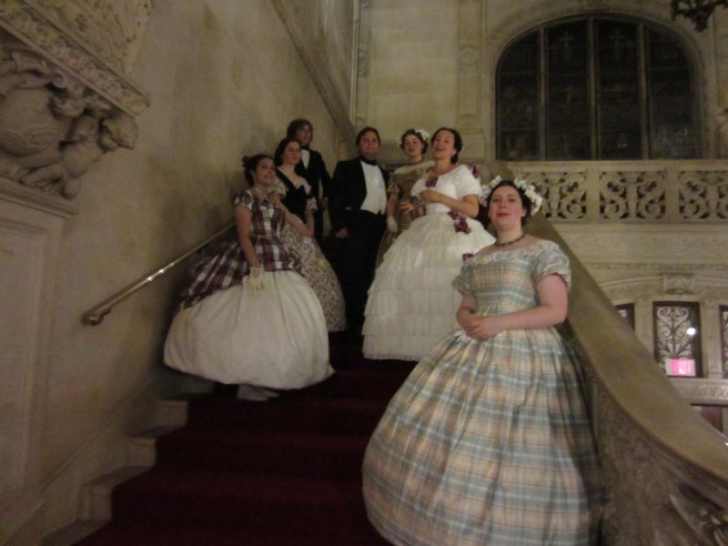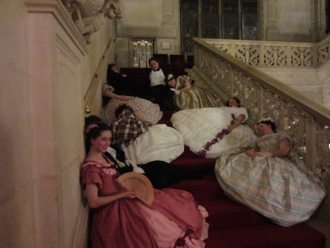 Congregating on the stairs. If you look closely, you can see the flower clump casualty on my dress.Such a lovely group of young people.Of course, we’re all very tired after our exertions…But that doesn’t stop us from taking animal pictures!Which made us laugh pretty hard.Bill Cunningham caught us taking photos on the stairs and was very excited. BUT… We caught Bill Cunningham taking pictures of us on the stairs!Halfway up the stairs, pretending to jump!A close up…Another view. It was particularly amusing to us because we were tired and the floor below the stairs is marble, so obviously one would not actually want to jump over the railing…Okay, now we’re trying to be serious and look like we’re having casual conversations.And now we’re being elegant. Look! Bill Cunningham!Descending the stairs with camera flashes going off as though I was a celebrity!But I’m not… I’m just me, missing a flower clump… backed by young men in tails…Momentary relaxation between photos…This was the skirt puddle pose which followed the traditional jellyfish dance… (aka all of us jumping up and down in a clump and moving through the rooms before suddenly plopping and letting our skirts billow around us).While being a jellyfish I lost a second clump of flowers! I didn’t think I had sewn them on so loosely!So sad. You know it’s a good ball when your dress suffers injuries not once, but twice!Oh my! Tartan drawers to match the tartan dress!I was so happy to just BE in Ochre Court. Do you get that feeling from this picture? I’m just soaking it all in.Exuberant might be a better word for me.“I love Ochre Court THIS much!”Posing by the fireplace in the white room. Isn’t it lovely?Don’t we look fabulous???The necessary bum picture, particularly amusing when wearing hoops.One last glimpse of the back lawn before we pack up to leave.I LOVE Ochre Court. I just wanted to drink it in as much as I possibly could.
