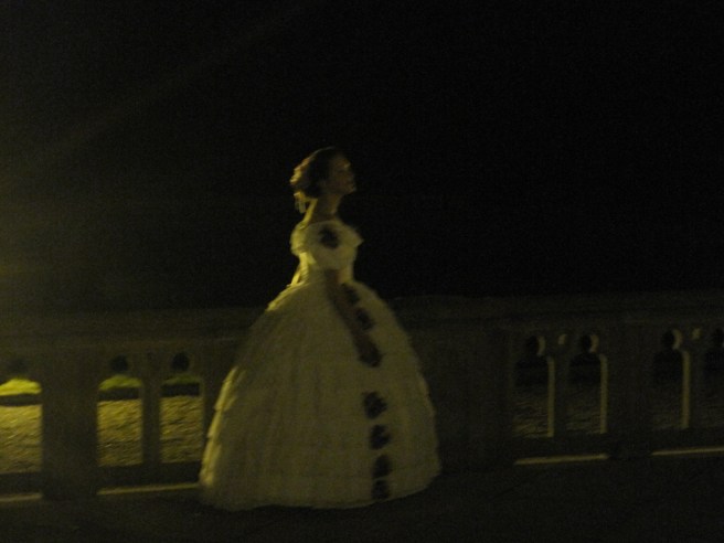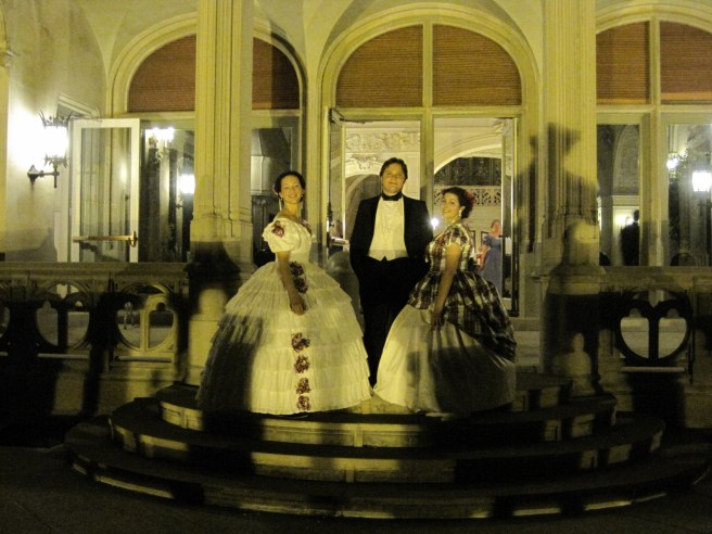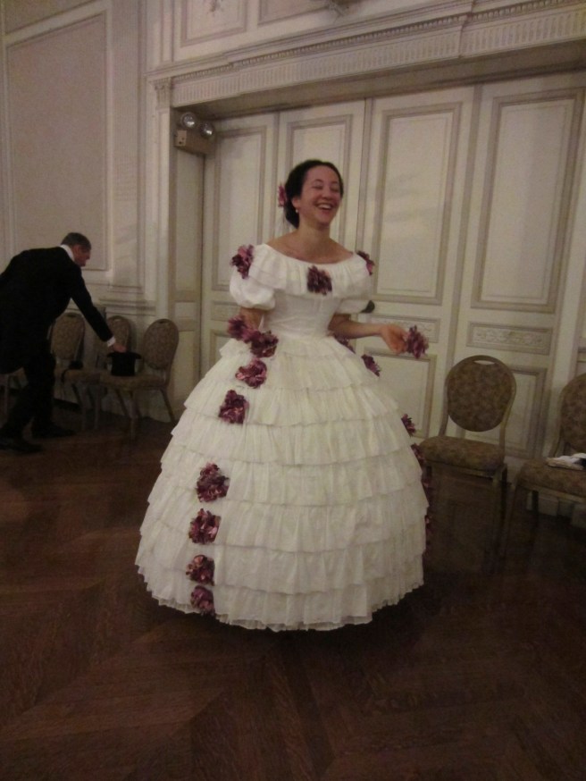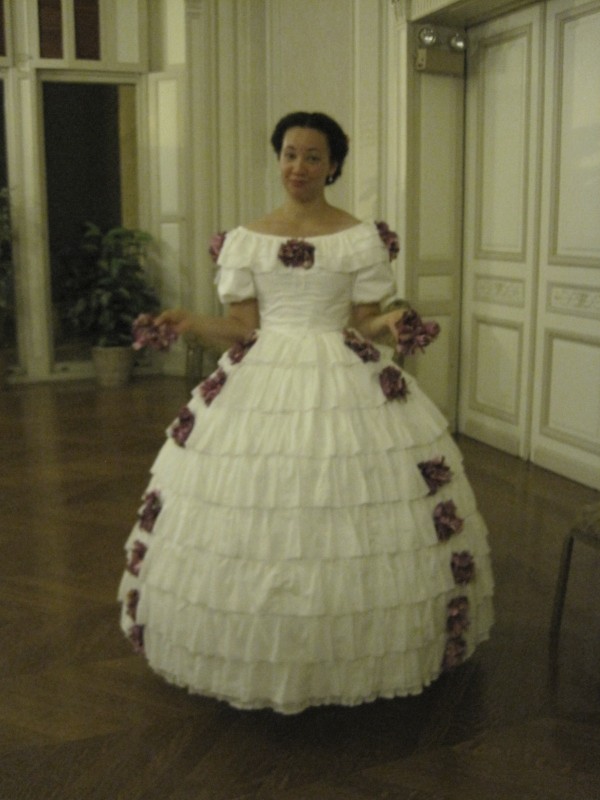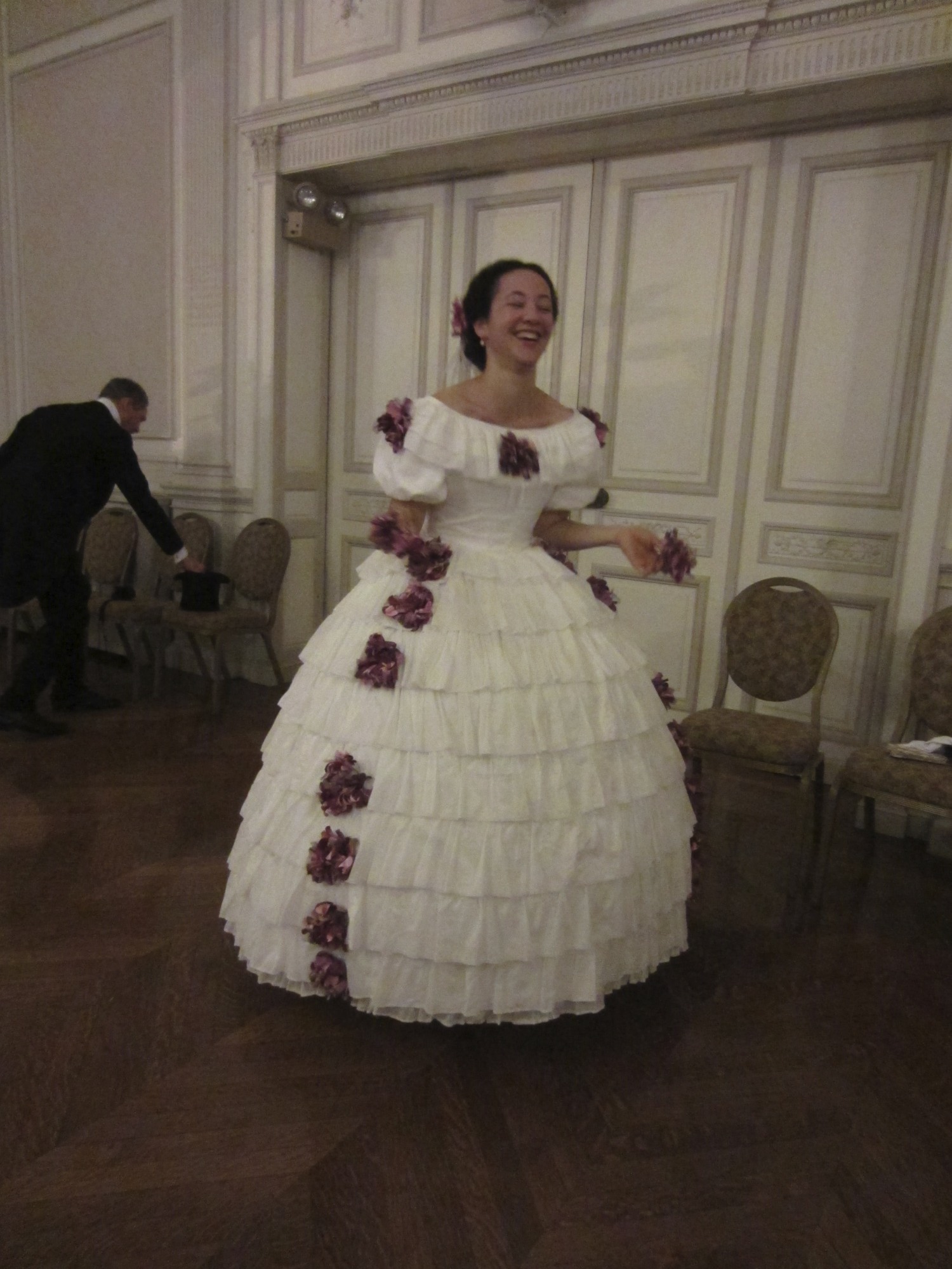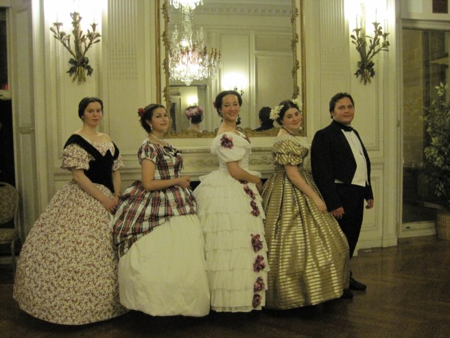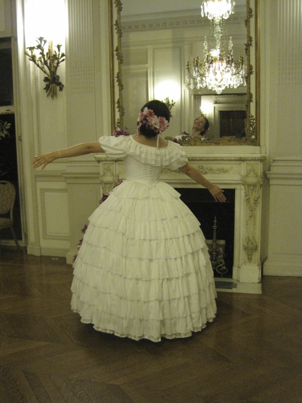 Congregating on the stairs. If you look closely, you can see the flower clump casualty on my dress.Such a lovely group of young people.Of course, we’re all very tired after our exertions…But that doesn’t stop us from taking animal pictures!Which made us laugh pretty hard.Bill Cunningham caught us taking photos on the stairs and was very excited. BUT… We caught Bill Cunningham taking pictures of us on the stairs!Halfway up the stairs, pretending to jump!A close up…Another view. It was particularly amusing to us because we were tired and the floor below the stairs is marble, so obviously one would not actually want to jump over the railing…Okay, now we’re trying to be serious and look like we’re having casual conversations.And now we’re being elegant. Look! Bill Cunningham!Descending the stairs with camera flashes going off as though I was a celebrity!But I’m not… I’m just me, missing a flower clump… backed by young men in tails…Momentary relaxation between photos…This was the skirt puddle pose which followed the traditional jellyfish dance… (aka all of us jumping up and down in a clump and moving through the rooms before suddenly plopping and letting our skirts billow around us).While being a jellyfish I lost a second clump of flowers! I didn’t think I had sewn them on so loosely!So sad. You know it’s a good ball when your dress suffers injuries not once, but twice!Oh my! Tartan drawers to match the tartan dress!I was so happy to just BE in Ochre Court. Do you get that feeling from this picture? I’m just soaking it all in.Exuberant might be a better word for me.“I love Ochre Court THIS much!”Posing by the fireplace in the white room. Isn’t it lovely?Don’t we look fabulous???The necessary bum picture, particularly amusing when wearing hoops.One last glimpse of the back lawn before we pack up to leave.I LOVE Ochre Court. I just wanted to drink it in as much as I possibly could.
