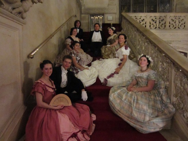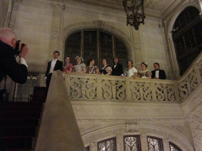 Last post, I left you just at the completion of our young set’s Speed Virginia Reel. This post is going to be a continuation of Ochre Court pictures, because there were too many I wanted to share for just one post. At the end of the ball we decided to get some young people pictures on the fabulous red carpeted stair case in the entry way, so that is where we begin Ochre Court pictures: part II.