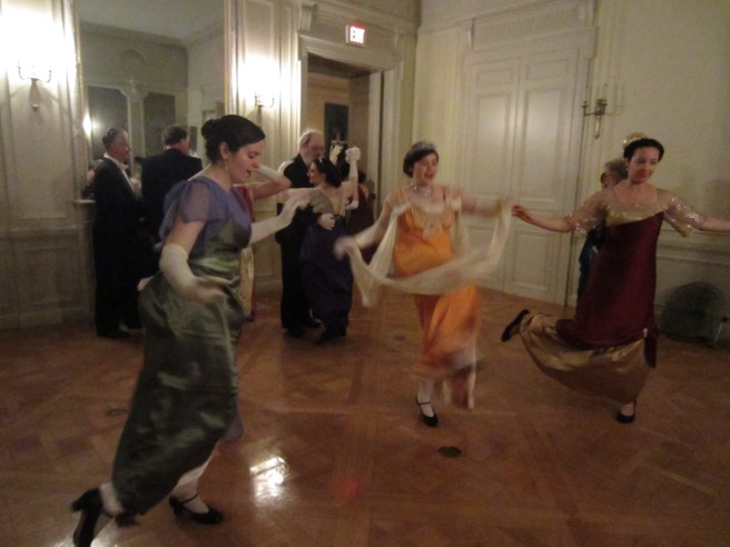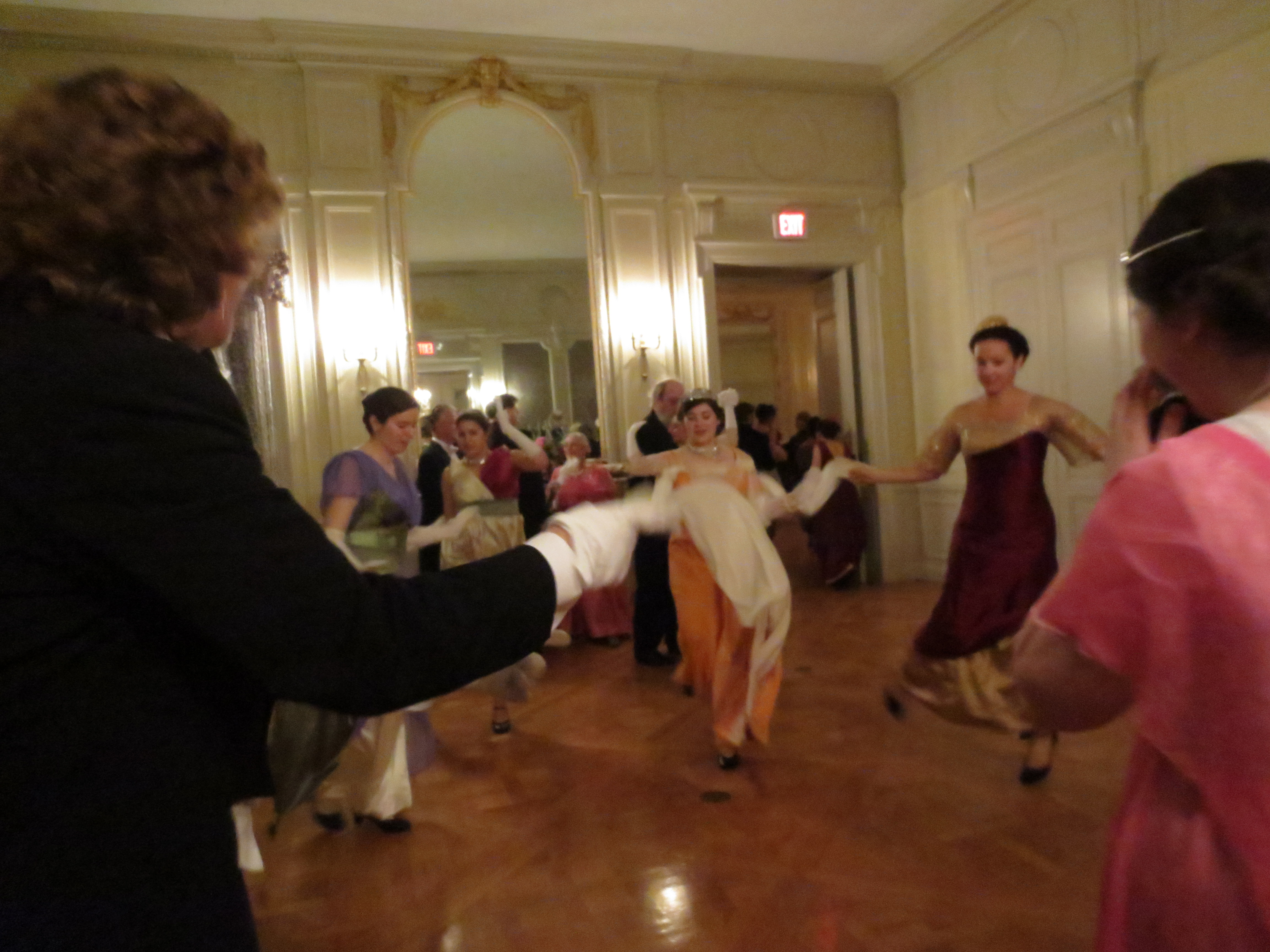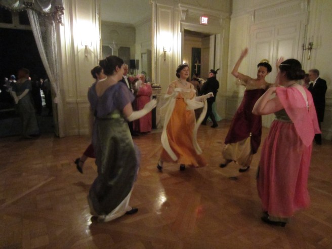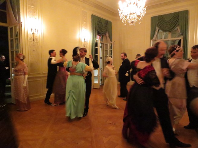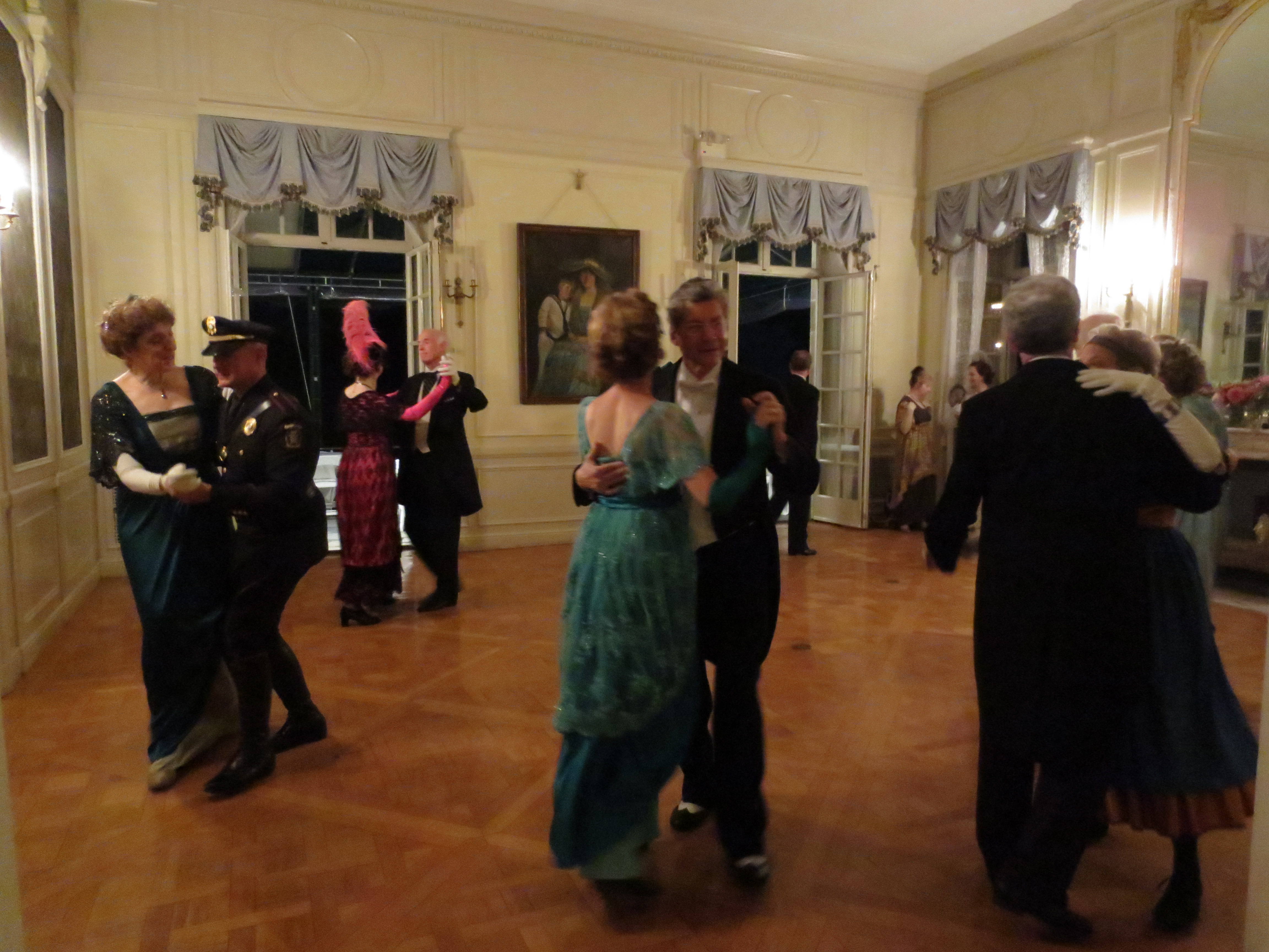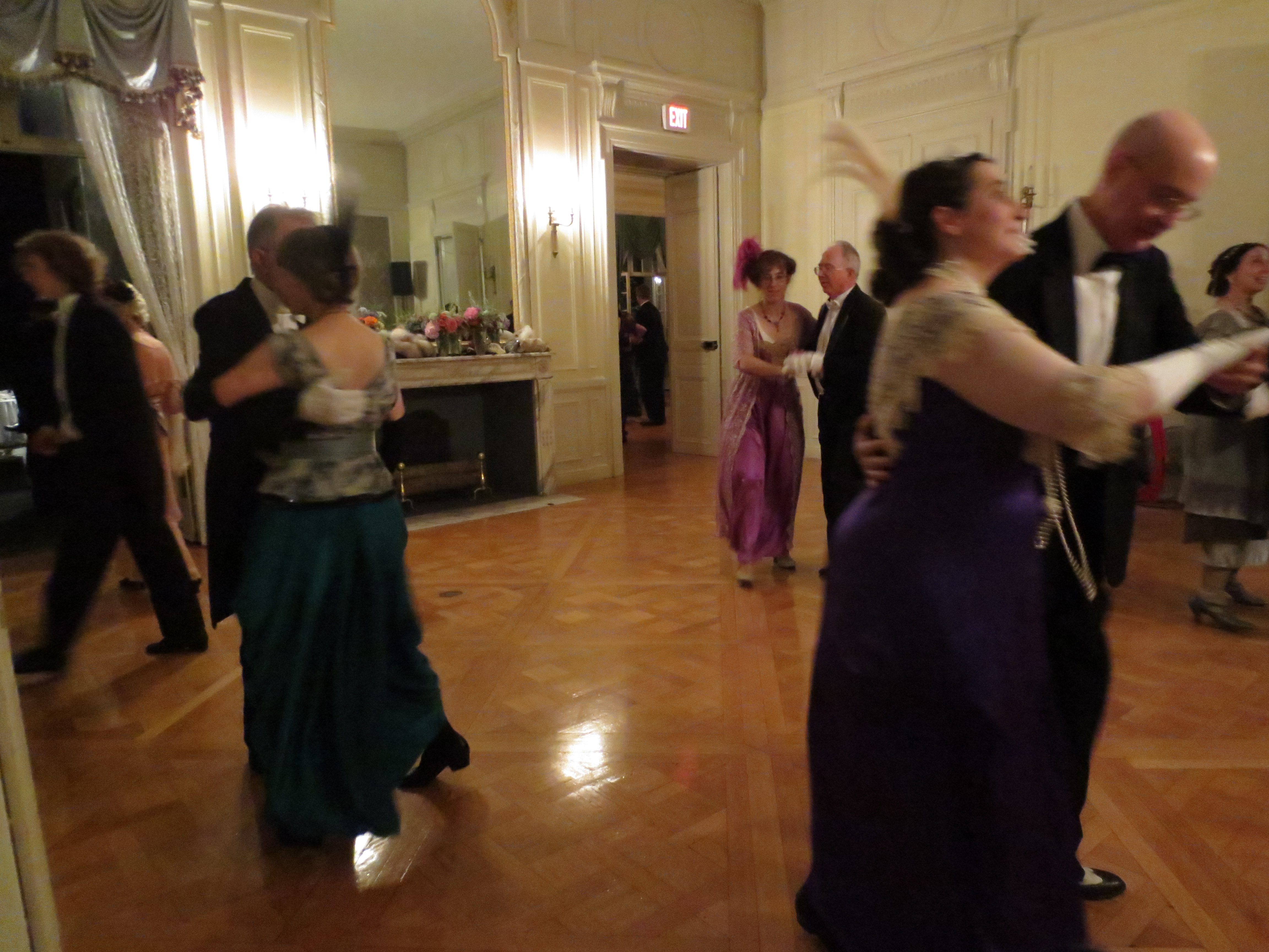 The light was fading as we returned from our adventures down by the water and on the dock… This is the back side of Glen Manor with the lights on in the downstairs rooms and the twilight sky behind.The orchestra for the night. I believe this is the New River Orchestra.The doors were thrown wide open to the patio and gardens, which allowed for picturesque viewing of the dancers.This was one of the venues in which the dancers progressed through a series of small-ish rooms.It was fun to look in and watch people dance. Because they were traveling through different rooms there were always new people to watch.There were lots of really beautiful gowns to admire.Dancers in the main ballroom.The interior of one of the beautiful rooms.The fabulous red carpeted staircase. Not quite as grand as Rosecliff or Ochre Court, but still beautiful.Most members of TNG lounging on the stairs.One of our faithful cameramen caught lounging without a camera in hand!None of the young set danced very much, but there were a few times we stood up and danced. This is one of them.And another, blurry, picture of members of the young set actually dancing.Photographic proof the Scott the Portsmouth Policeman danced (and with one of our own young set–as well as many other dancers).On the left is Scott the Policeman. Elsewhere are other wonderfully dressed dancers.We may not look like we’re dancing, but we had just finished a tango. One of the few times the young set danced.We did get up to dance the Charleston!And we basically had the room to ourselves, which meant we could be super silly!A silly Charleston figure called something like “shine your shoes.”Charleston in a line. A TNG favorite.The traditional TNG “raise the roof” Charleston! (It’s like patting your head and rubbing your stomach… to Charleston while raising the roof! You should try it!)Follow the leader. Now everyone is doing the “raise the roof” Charleston!Double trouble! We caught one of our TNG faithful photographers and Bill Cunningham in the same picture!I believe at least some of us are doing the “flying Charleston” in this picture.Yay! We Charleston-ed!We’re all laughing and smiling! Doesn’t it look like a wonderful time? Don’t you just want to jump in the photo and join us?Two fabulous TNG-ers.The fearless leader of TNG and the Commonwealth Vintage Dancers. What a fabulous fan! Doesn’t it just scream for sillyness?Well, here you go! Sillyness! (Can you tell that it’s her tail? Like a peacock?)Okay, I’m not actually asleep… but the stairs were a pretty comfy place to relax… Clearly, it is nearing bed time.“Follow the moon path!” I said, knowing you can’t actually follow the moon path over the water. It’s a good metaphor for life though, to follow your dreams.Last view of Glen Manor that night, with the lights on and the rising moon. So lovely!