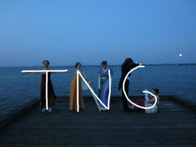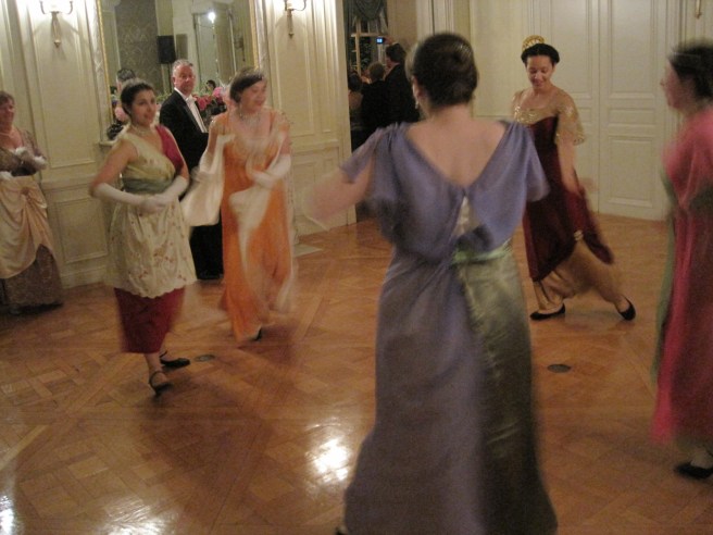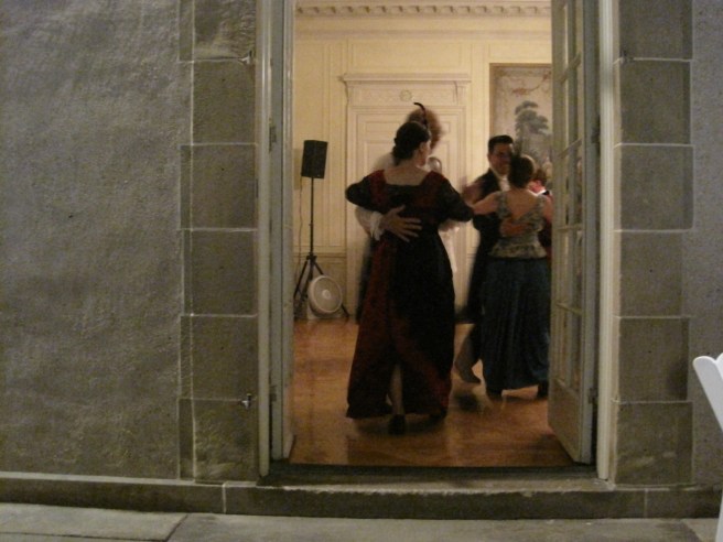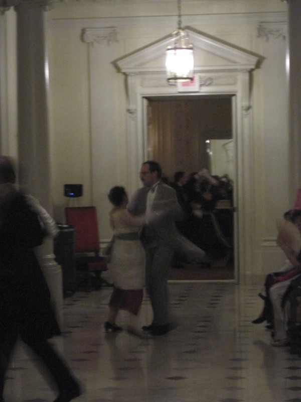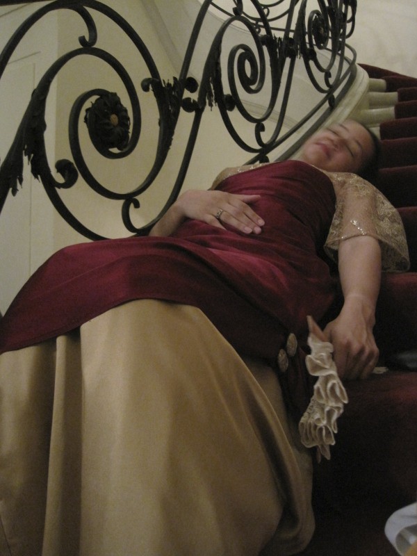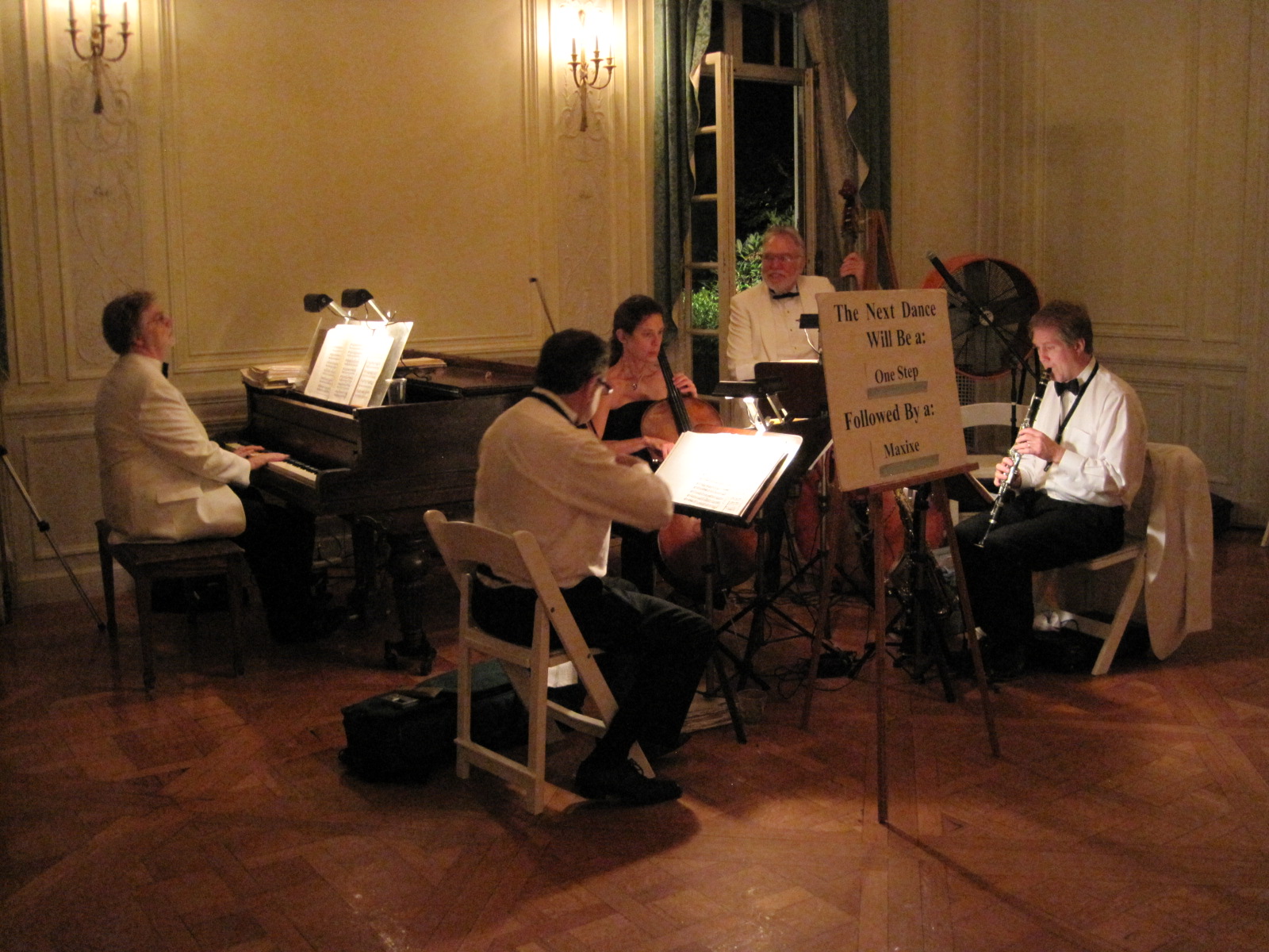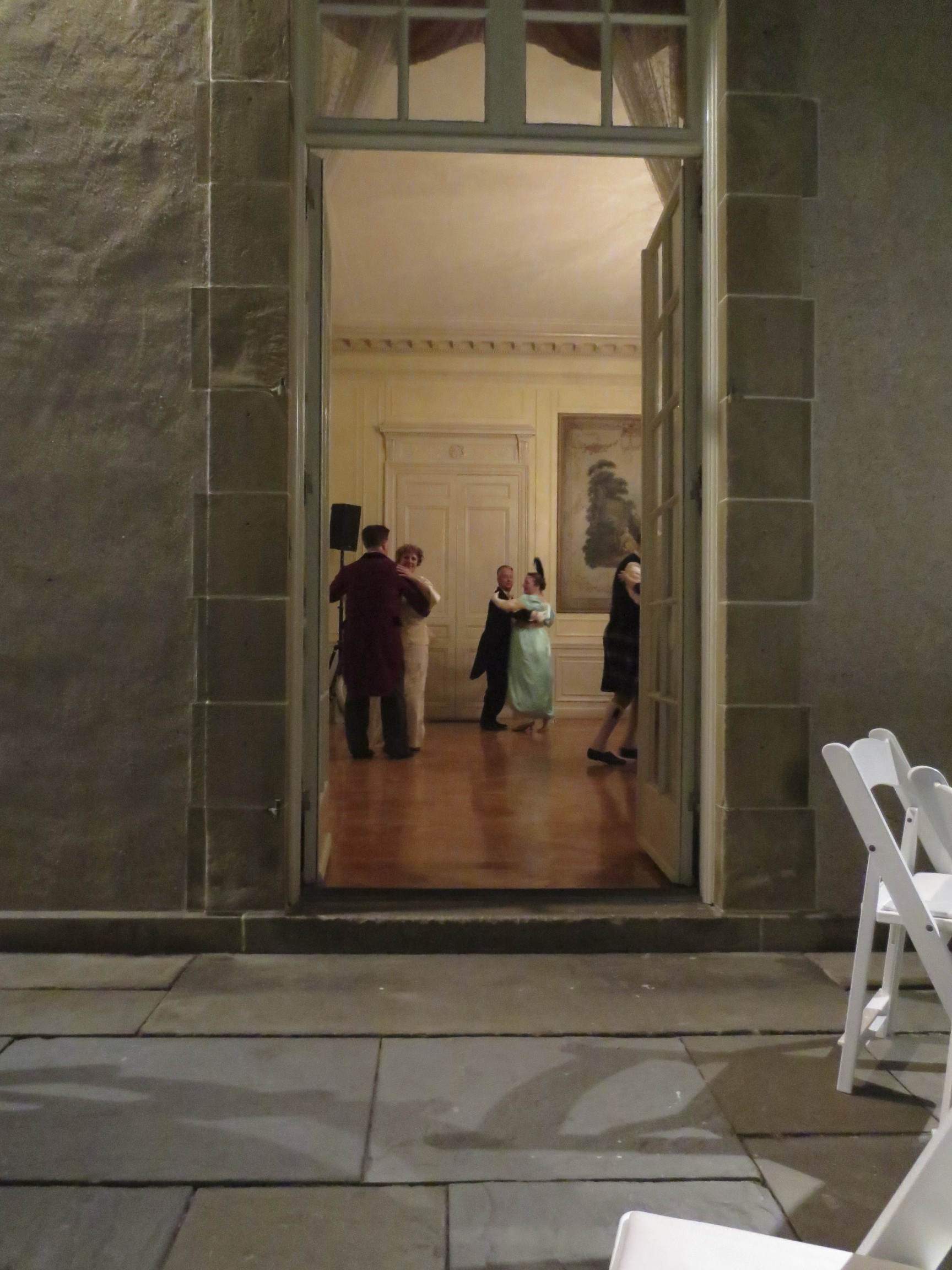 The light was fading as we returned from our adventures down by the water and on the dock… This is the back side of Glen Manor with the lights on in the downstairs rooms and the twilight sky behind.The orchestra for the night. I believe this is the New River Orchestra.The doors were thrown wide open to the patio and gardens, which allowed for picturesque viewing of the dancers.This was one of the venues in which the dancers progressed through a series of small-ish rooms.It was fun to look in and watch people dance. Because they were traveling through different rooms there were always new people to watch.There were lots of really beautiful gowns to admire.Dancers in the main ballroom.The interior of one of the beautiful rooms.The fabulous red carpeted staircase. Not quite as grand as Rosecliff or Ochre Court, but still beautiful.Most members of TNG lounging on the stairs.One of our faithful cameramen caught lounging without a camera in hand!None of the young set danced very much, but there were a few times we stood up and danced. This is one of them.And another, blurry, picture of members of the young set actually dancing.Photographic proof the Scott the Portsmouth Policeman danced (and with one of our own young set–as well as many other dancers).On the left is Scott the Policeman. Elsewhere are other wonderfully dressed dancers.We may not look like we’re dancing, but we had just finished a tango. One of the few times the young set danced.We did get up to dance the Charleston!And we basically had the room to ourselves, which meant we could be super silly!A silly Charleston figure called something like “shine your shoes.”Charleston in a line. A TNG favorite.The traditional TNG “raise the roof” Charleston! (It’s like patting your head and rubbing your stomach… to Charleston while raising the roof! You should try it!)Follow the leader. Now everyone is doing the “raise the roof” Charleston!Double trouble! We caught one of our TNG faithful photographers and Bill Cunningham in the same picture!I believe at least some of us are doing the “flying Charleston” in this picture.Yay! We Charleston-ed!We’re all laughing and smiling! Doesn’t it look like a wonderful time? Don’t you just want to jump in the photo and join us?Two fabulous TNG-ers.The fearless leader of TNG and the Commonwealth Vintage Dancers. What a fabulous fan! Doesn’t it just scream for sillyness?Well, here you go! Sillyness! (Can you tell that it’s her tail? Like a peacock?)Okay, I’m not actually asleep… but the stairs were a pretty comfy place to relax… Clearly, it is nearing bed time.“Follow the moon path!” I said, knowing you can’t actually follow the moon path over the water. It’s a good metaphor for life though, to follow your dreams.Last view of Glen Manor that night, with the lights on and the rising moon. So lovely!