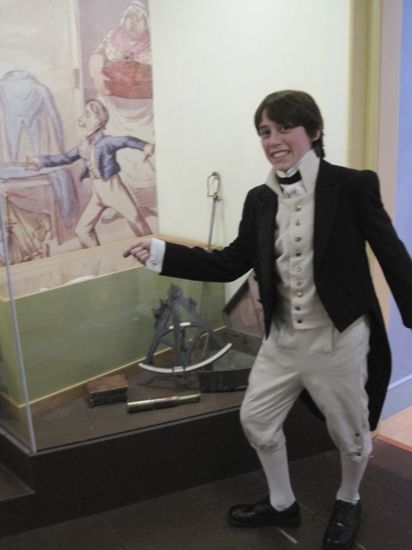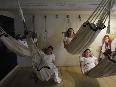 Waiting for the Constitution to get under way. If you look really closely you can see her name poking out from behind our heads.There she is, being tugged out of Boston Harbor.Watching her being tugged away.We wanted to be on the opposite side of the wharf for the Constitution’s return, so a few of us ran around (it was maybe 1/4 of a mile)… Along the way was a deserted parking lot we could either go around, or through… Of course we went through, which involved climbing/jumping/falling over the metal barricades… You should know that going around would have been an extra 90 feet or so of walking (ie. not much)…But we made it without injuries! Here is the Constitution being tug pushed back into alignment to return to her docking area. You can see the modern marines furling the sails, so clearly, she actually did use them.The four adventurous ladies who surmounted barricades to get great Constitution shots.As she slowly glided into place we took the opportunity to wave at the reenactors and modern marines aboard. Some of them even waved back!See all the people on the deck? Some of them, with the not modern shaped hats are the reenactors. It’s really cool that they were able to sail on the Constitution!On our way back to join our friends we had time to stop at this large anchor.In the museum. The banner states the whole purpose of the weekend’s celebrations.He’s not a cardboard cut out…Upstairs at the museum is a hand’s on walk through being aboard the Constitution in 1812. At this point, you get to hoist Billy the Goat aboard for food stores (he’s stuffed and makes loud goat sounds as you hoist him!).There were lots of paintings and informational signs to imitate.Then there’s this great spot, where you can stand on a rigging rope and furl a sail. This rope is only about 6″ off the ground, but obviously the real sails are much higher up.Yup. Here’s the real Constitution, with real modern marines in the rigging.There are other interactive things as well. Here, I am scrubbing the deck!In this room, you can climb into hammocks. The floor is super squishy, in case you fall out! The hammocks were actually pretty comfortable. And you see the guy in the corner? He’s another cardboard cut out.