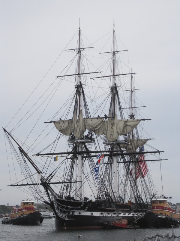 In this second installment of the Guerriere weekend, we’ll look at pictures relating to the USS Constitution and the USS Constitution Museum. As I mentioned in my first post about the weekend, I sorted the pictures into loose categories to break them up for blog posting purposes. These pictures are all from Sunday, when the USS Constitution was tugged out of Boston harbor and sailed out in the Atlantic under her own power (this is one of the first times this has happened in about the last century! She is tugged and turned around every year or so, I think, but she doesn’t sail under her own power at those times.). From the Charlestown Navy Yard we could see the tugging, but unfortunately the open Atlantic was too far away for us to see her sailing under her own power. Despite that sad fact, it was still exciting to see her move!