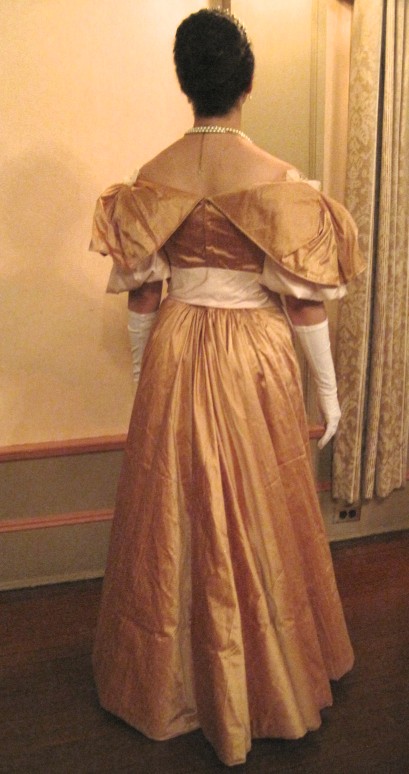 In the picture above you can see the jewelry better. You can also see the one major flaw in this dress. The wide neckline wasn’t shaped quite right, so the sleeves started slipping off my shoulders, making the sleeves look slightly less impressive. This is one of those things that was perfectly fine in all my fittings. It’s during those pesky balls, when you move and sweat, that you really discover the flaws in your clothes! I’ll have to do something about that before I wear the dress again.