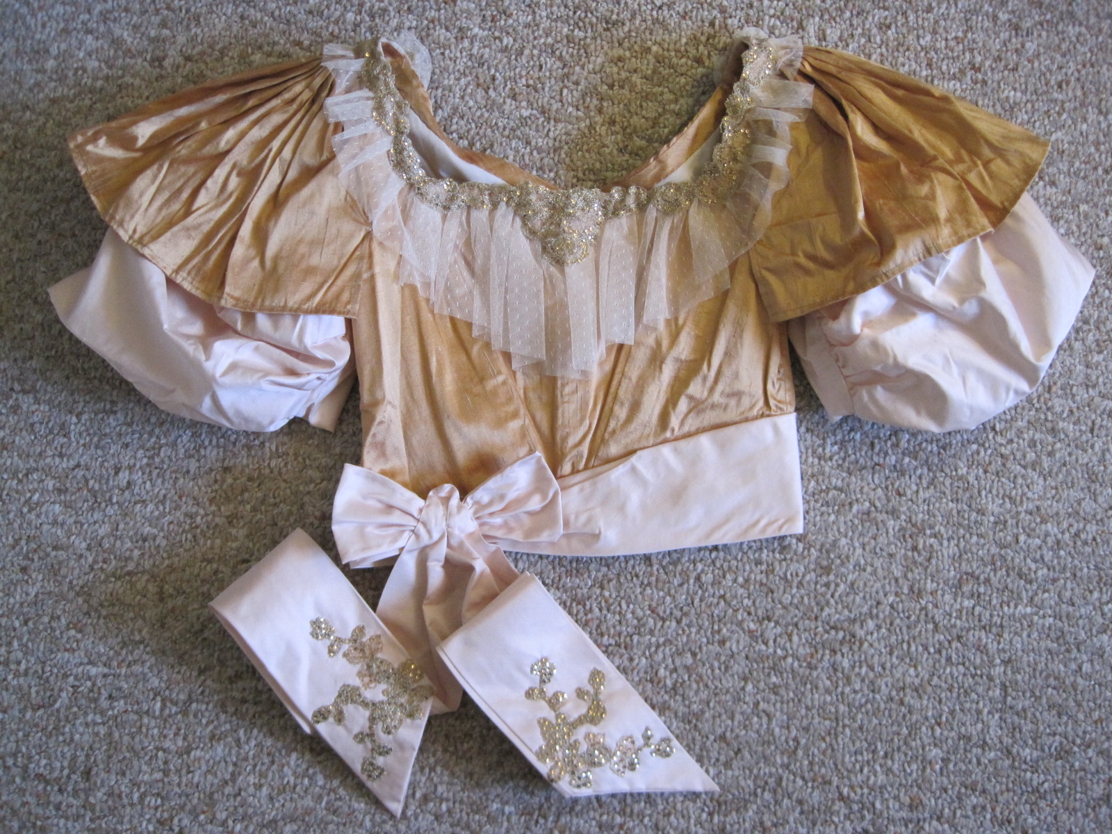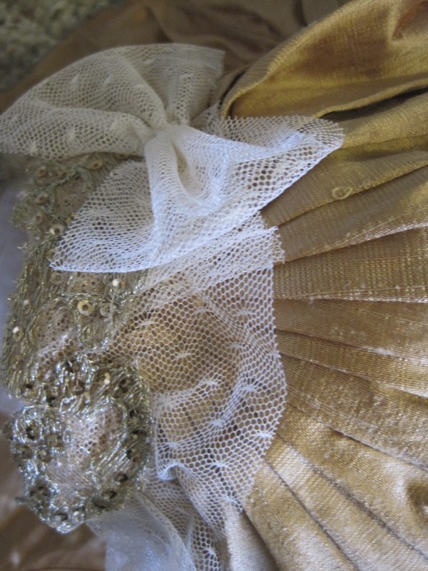 A closup of the shoulder and top of the sleeve. You can see the ivory net trim around the neck of the bodice, which terminates in those cute bows on the shoulder. The bronze part of the sleeves are rectangles that are knife pleated radially at the shoulder, which you can see in this photo. And finally, you can see the gold net applique which is stitched over the ivory net around the neck opening.