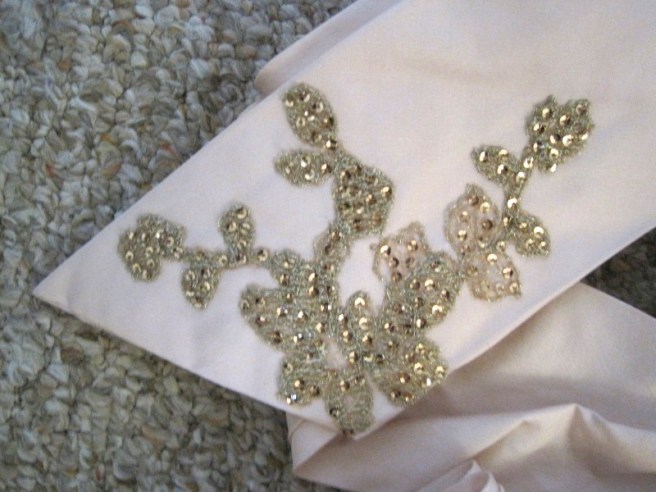 Here is the net applique on the sash ends. The net is great because it doesn’t fray, so I simply had to cut out the motif I wanted and then stitch it around all the edges to the sash. The sash is a tube of bias finished at an angle on the ends with a slip stitch.