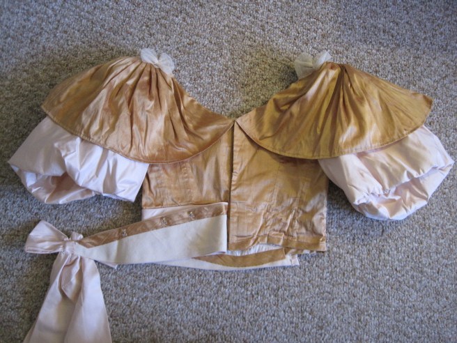 Then comes the question, where are the closures on this bodice? Well, the sash is stitched to the bodice from the right side front around the left side to center back. Then the bodice opens up center back.