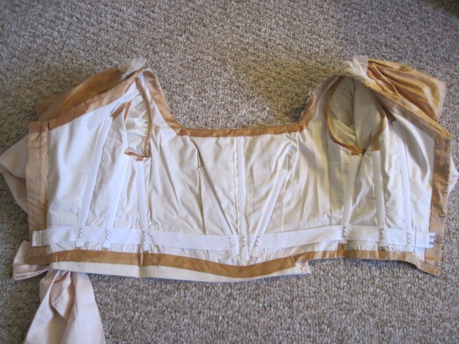 The left side. On the waistband I did use the metal bars instead of thread loops, since I knew they wouldn’t be seen from the outside. You can also see how the sash was attached. It was flipped up and topstitched to the bodice (avoiding bones!), then flipped down to cover the raw edges and joined to the bottom of the bodice with bias.
