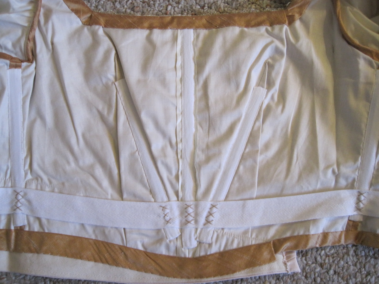 Center front. The boning channels were whip stitched to the cotton lining along the sides. It was a bit of a logistal problem to determine how to nicely bind off the edges of the bodice with bias, since there is a sash part of the way around. You can see that there is a separate piece of bias covering the join between the sash and the bodice from the right side where the sash opens.