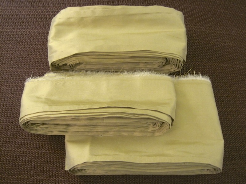 Did I mention I’m hand sewing all of this? All of these trim bits on the skirt will be gathered to a ratio of just over 1 1/2 to 1 (that was all that my yardage would accommodate). The zig zag is hemmed on both sides and will be sewn onto the skirt with a band of green silk running down the middle. The rosettes will be gathered in the middle and the raw edges hidden, which is why that bit is hemmed on only one side. The ruffle at the bottom will be bound at the top, which is why only one edge is hemmed.