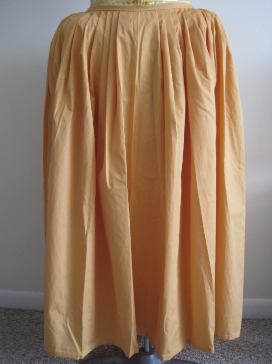 How historically accurate?: I give it 70%. Accuracy gets knocked down because: 1- the color is a bit vibrant for the period (but it’s an under petticoat, and I wanted it to be fun!), 2- all unseen seams are machine sewn, 3- I used bright yellow polyester ribbon for ties, 4- I haven’t seen much research that shows cotton being used at this time for a single plain petticoat of this sort. On the other hand: 1- all finishing was done by hand, 2- the dimensions and method of creation are historically accurate.