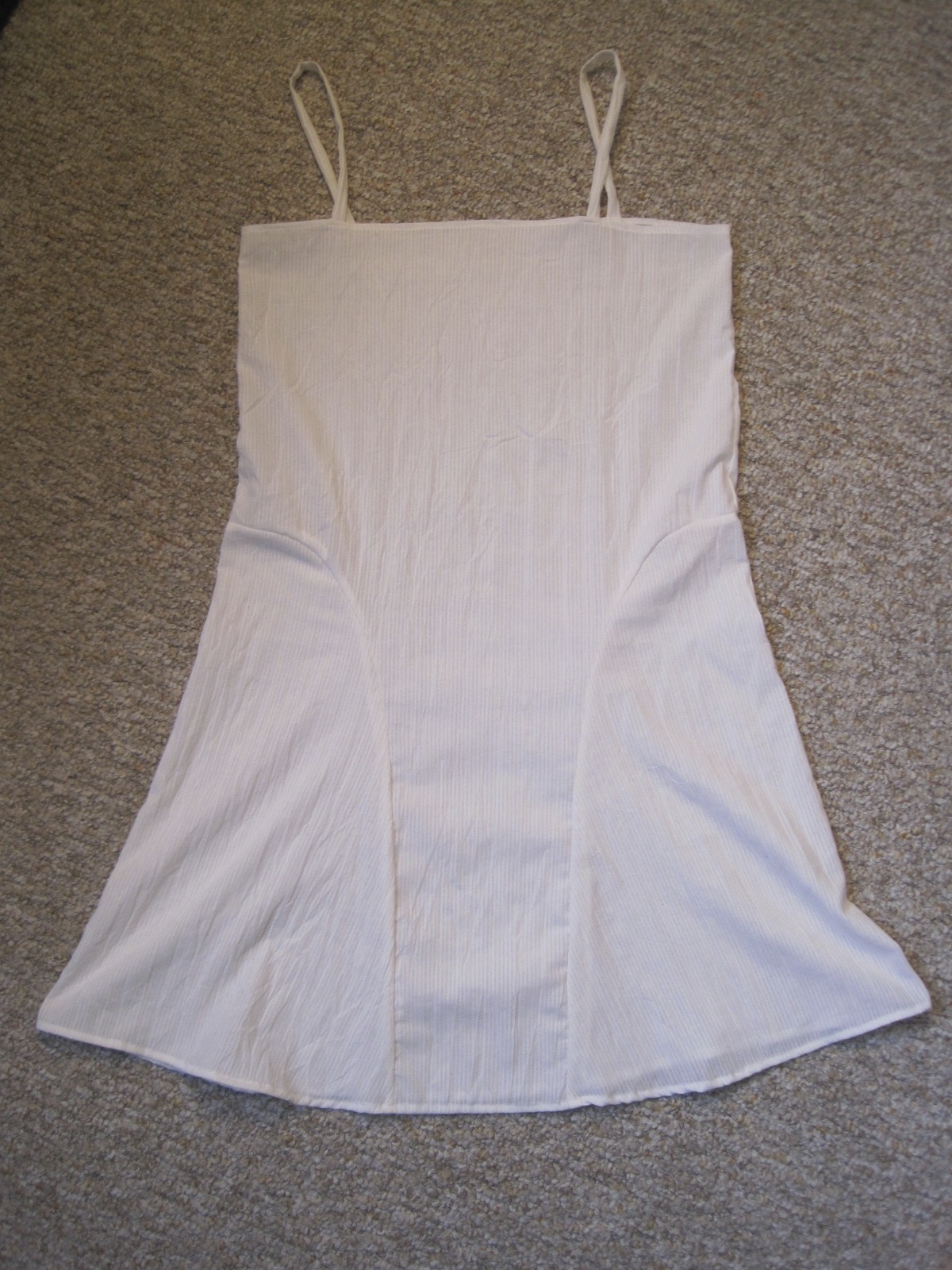 The blue cotton is slightly sheer, so I made a cotton slip to wear under the dress to add opacity. It’s made of the same $1/yd white cotton that the trim on the dress is made of, so if it shows at the neck or elsewhere it just blends right in. I used the same measurements I used for the pink slip of my 1925 beaded dress. I was inspired by looking at 1920s patterns to add the curved panels on the side instead of having another straight slip.