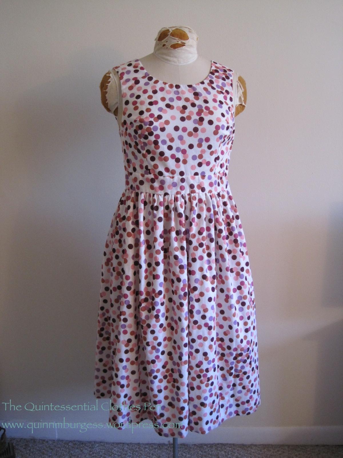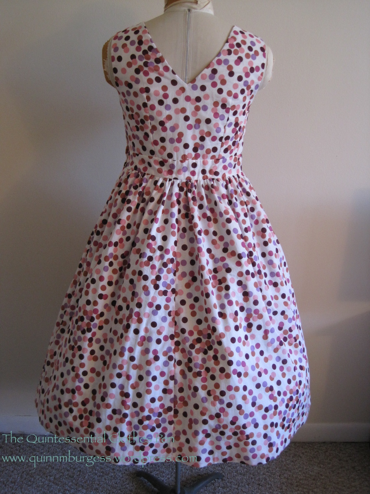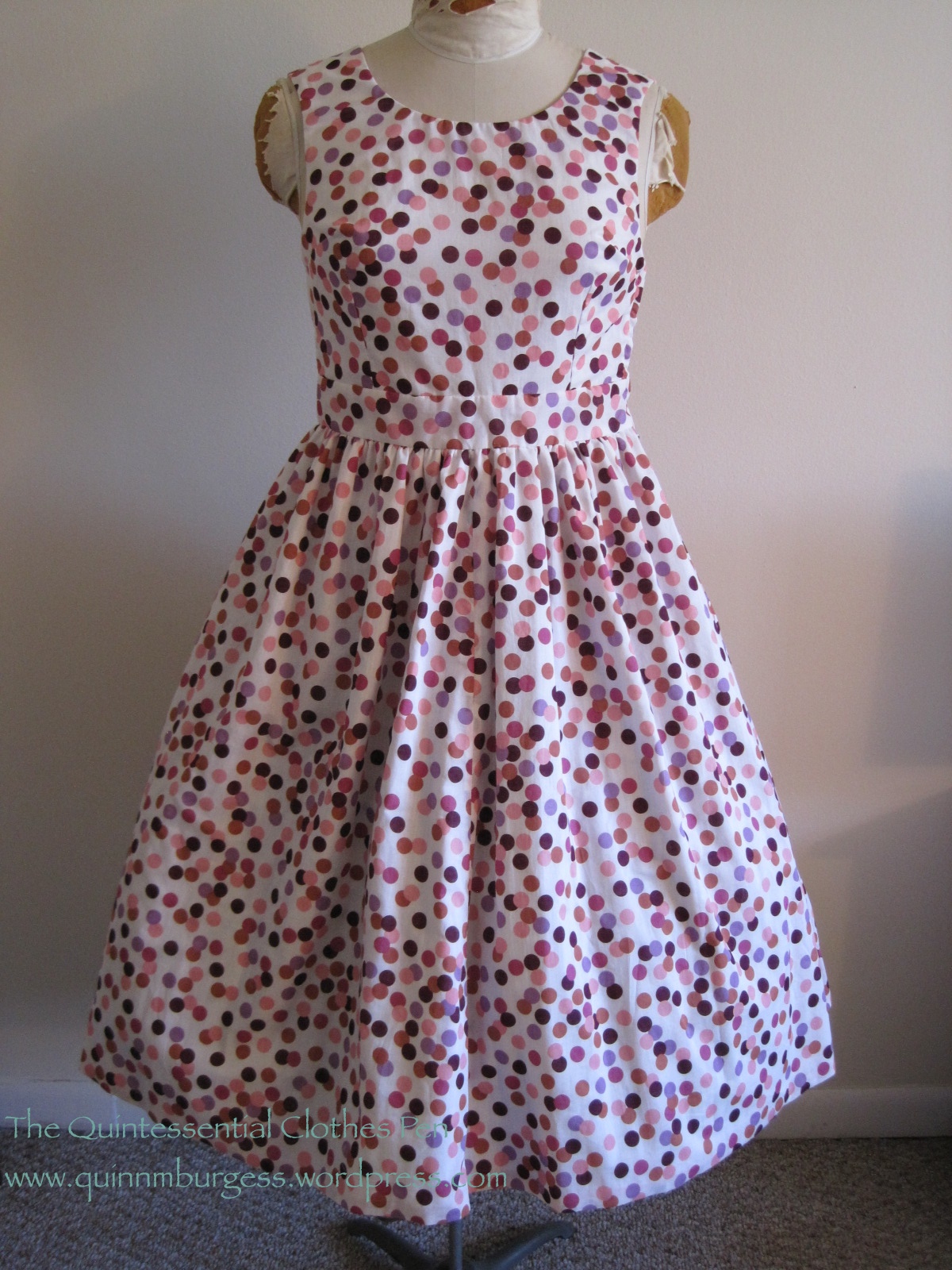 It’s been months since I bought the fabric for this dress (I actually had to look back to see when I purchased the fabric: it was February). I bought it rather on a whim, with the goal of expanding the number of patterned dresses in my historic wardrobe. Well, success! My 1953 dot dress is complete!