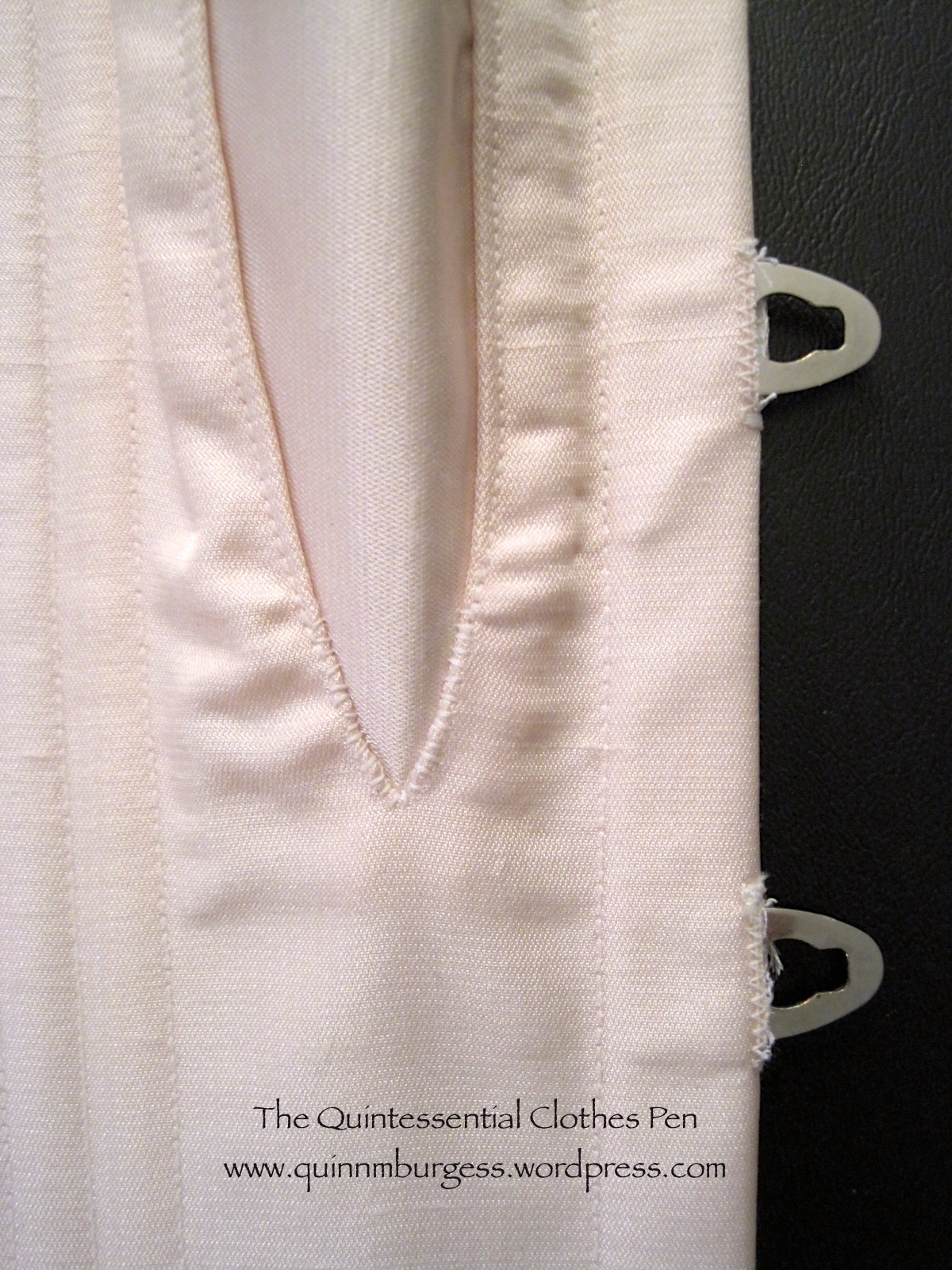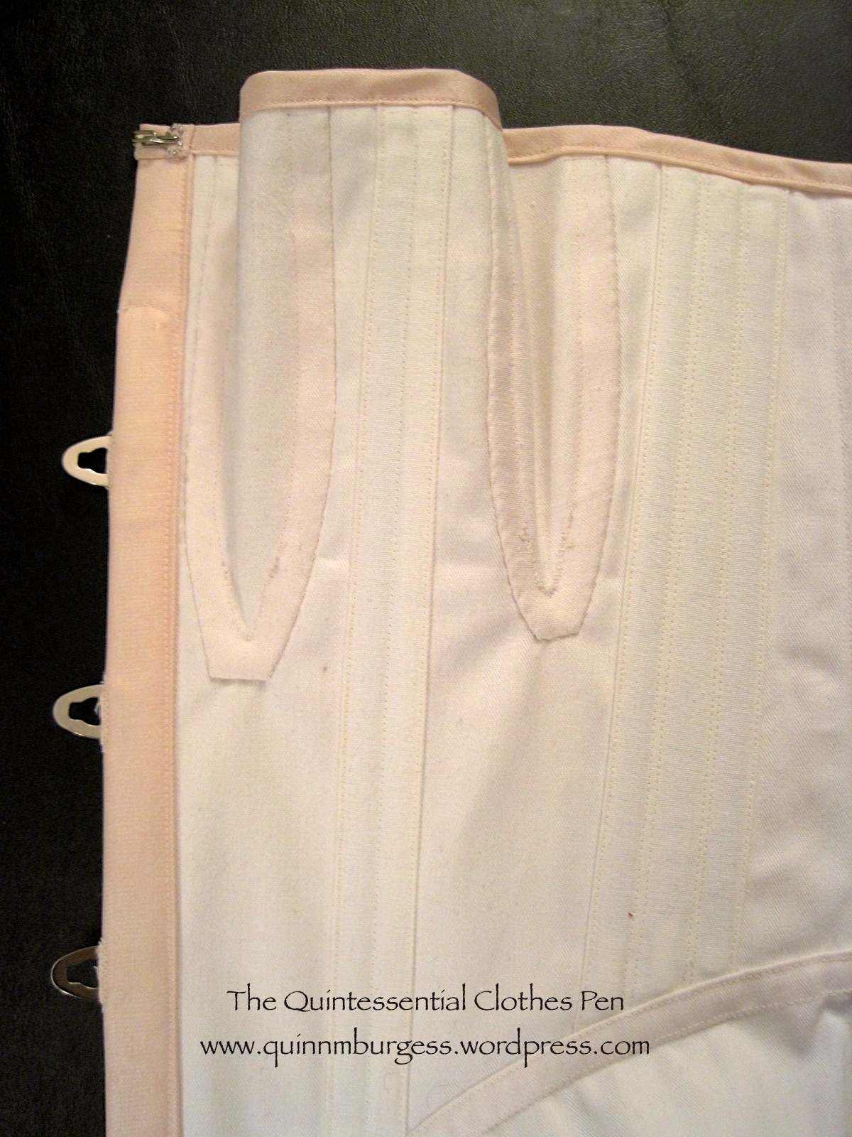 An interior view of my corset. It’s important to me that the inside of garments is as nicely finished as the outside, as you can see. It’s a little hard to see, but the grommets near the waist are set closer together than the ones a the top and bottom.