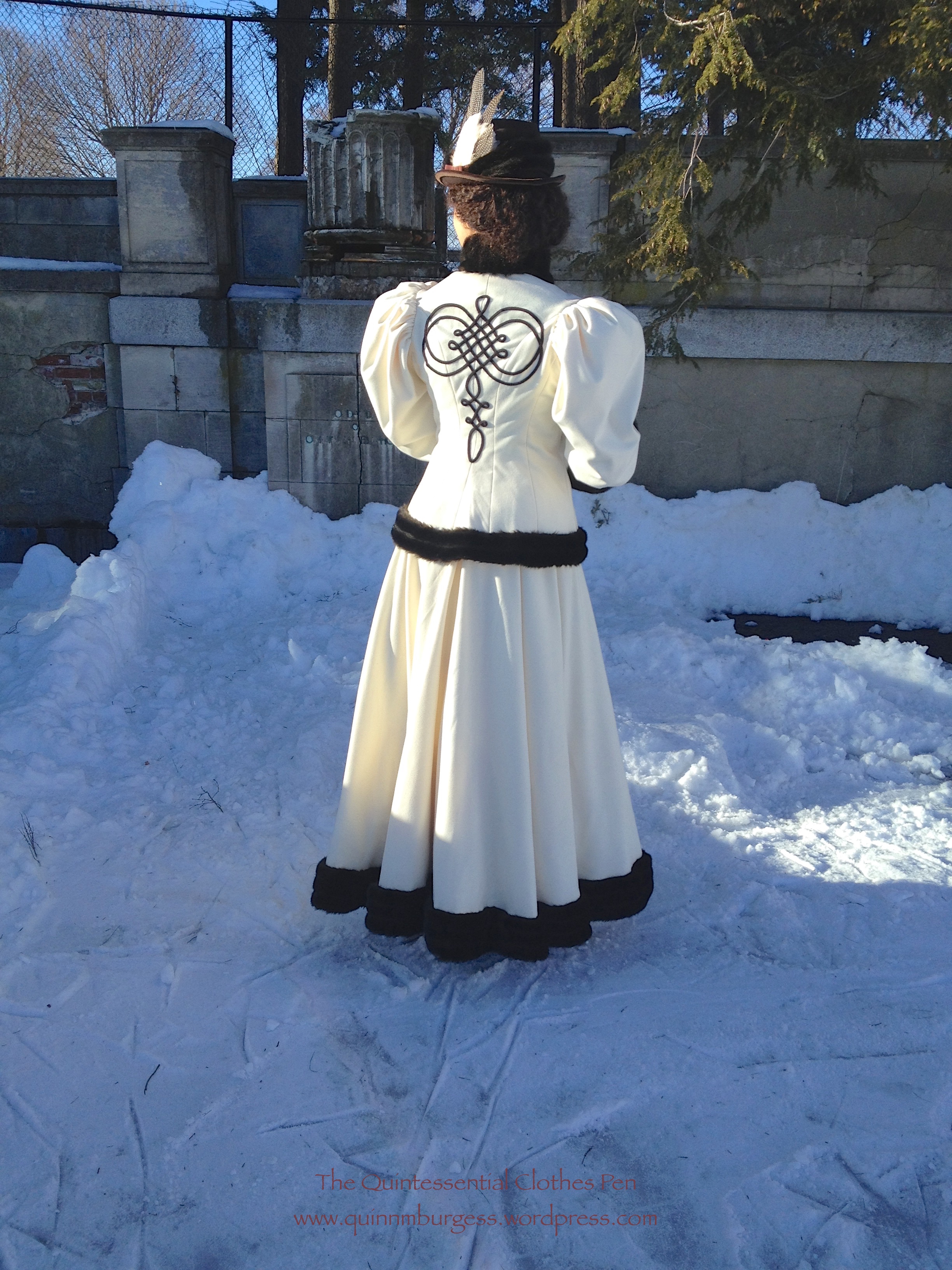 How historically accurate is it? Pretty darn good. Definitely recognizable by someone in the 1890s. The construction is accurate, aside from the use of hug snug instead of bias and faux fur instead of real fur. So, 95%.