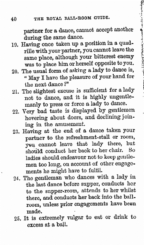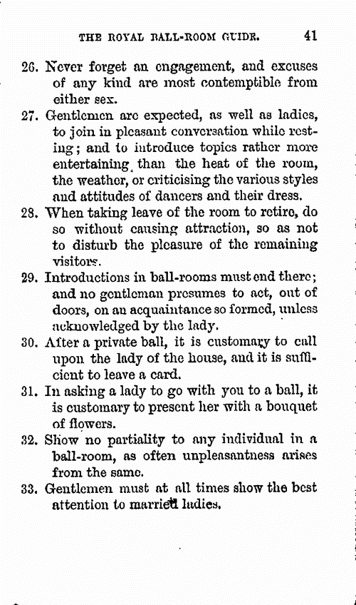 For your 19th century ballroom edification today, we have a list of etiquette points from The Royal Ball-Room Guide and Etiquette of the Drawing Room, 1877 (available through The Library of Congress). This is a great digest of lots of etiquette points on a variety of topics.