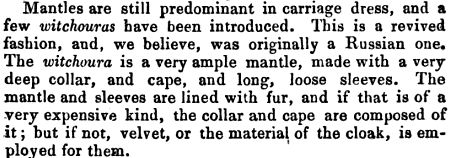 Moving forward once again, C. Willet Cunnington mentions witzchouras in his book English Women’s Clothing in the 19th Century referencing a year as late as 1849: “The Witzchoura Mantle, for the carriage, lined and trimmed with fur.”