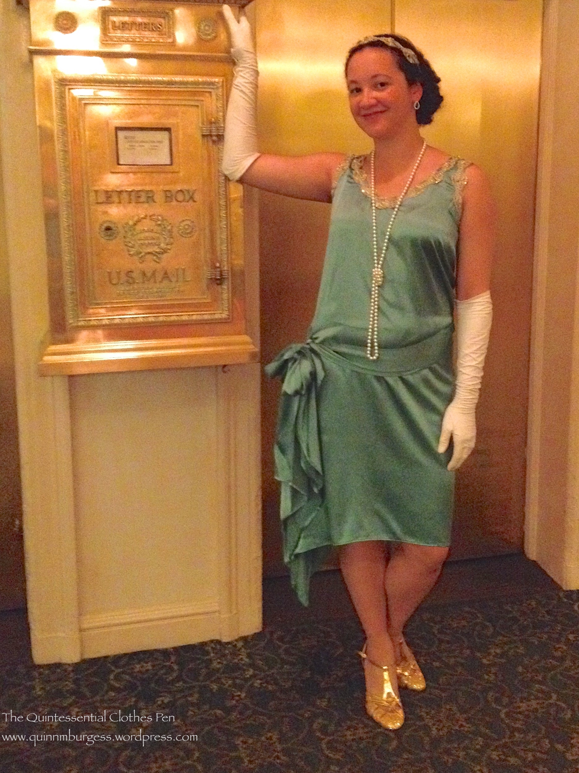 Perhaps you remember this late 1920s green dress, which I made and first posted about in 2012? When it was first completed, I was in the midst of creating lots of new things for Newport Vintage Dance Week and was grateful that it had made it to a wearable state. I hadn’t quite solved the issue of keeping one side bunched up, so for the first wearing I used the bronze sequined flower pin you see in the picture below.
