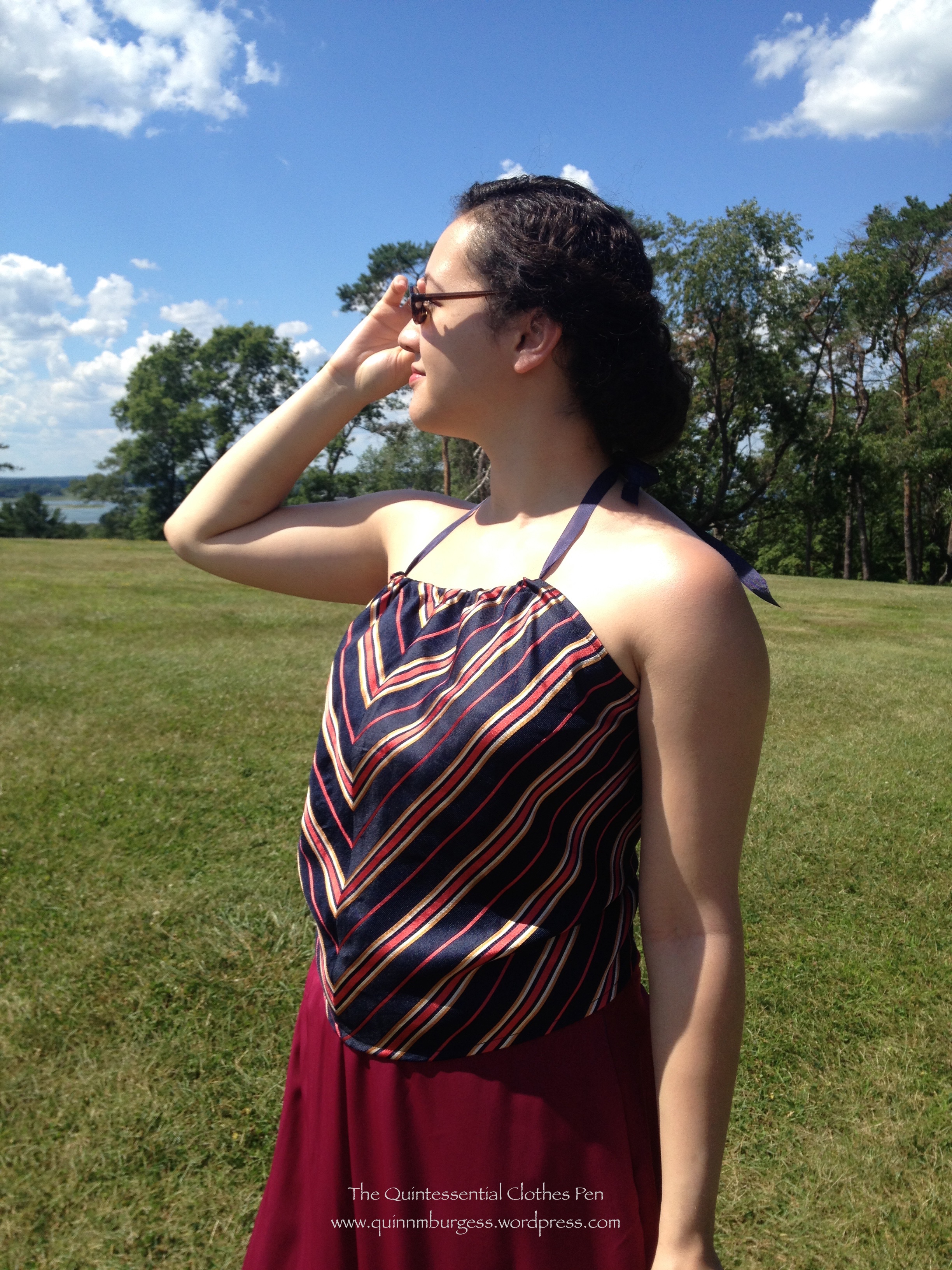 The halter was made using Leimomi’s tutorial “How to make a 1930s style handkerchief halter top“. I used an old striped silk twill fabric remnant rather than a handkerchief, so I had to finish my edges, but I also had to piece the fabric to get the right beginning square rather than rectangle shape. I also made my square a bit bigger than a scarf’s dimensions so that my lower back would be totally covered by the halter. And I used hug snug for my tie, because it was all I had on hand that matched. The halter was pinned around my body to a comfortable point on each side.